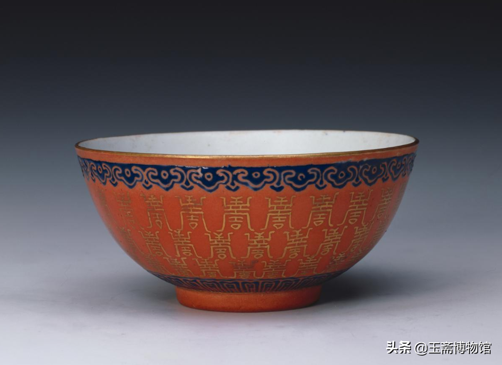 里松石绿釉外白地矾红彩描金寿字碗北京故宫博物院藏