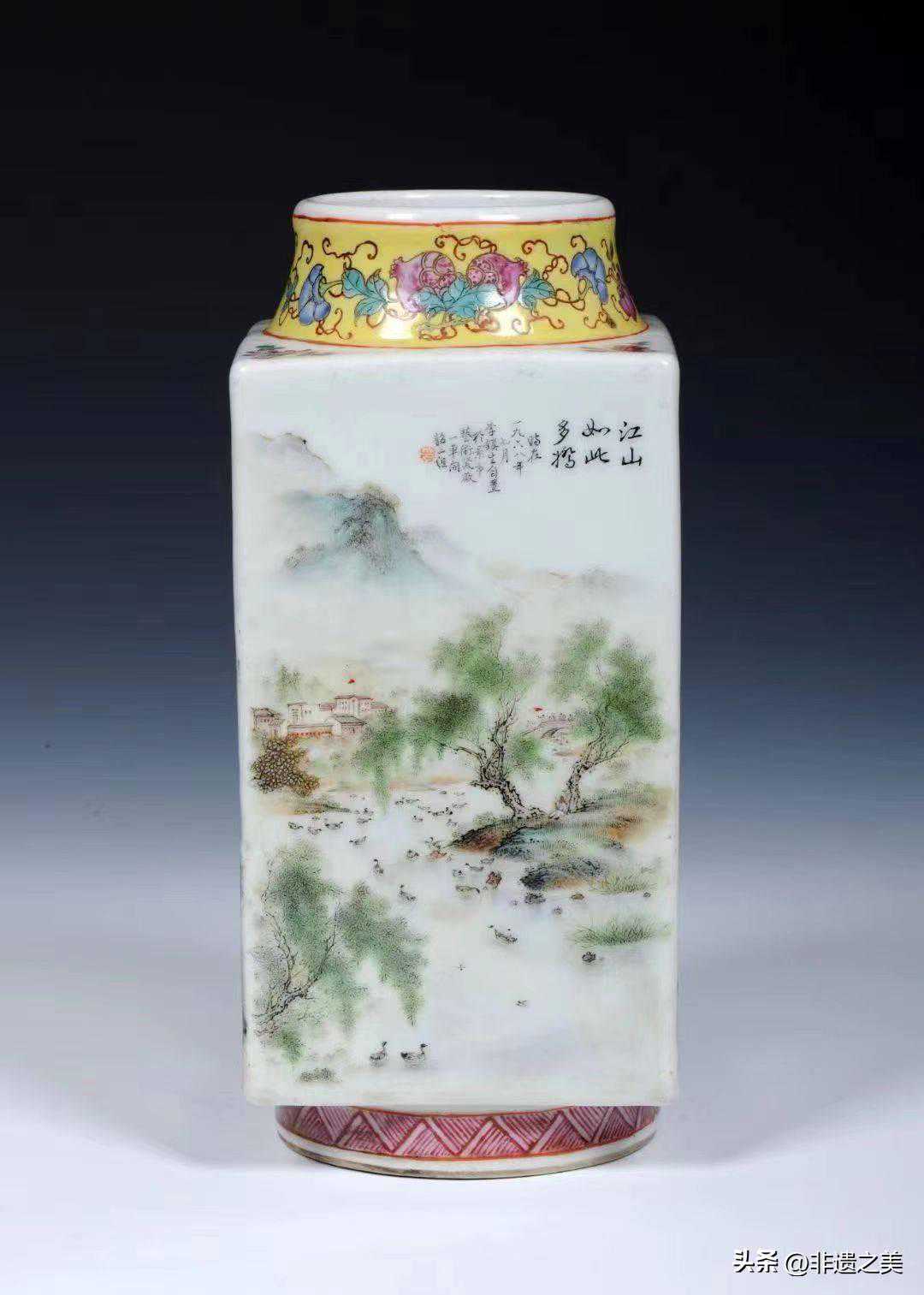 “新粉彩瓷”以”文人画旨趣“入粉彩,并由“珠山八友”等当时有绘画功力的陶瓷艺术家将这种旨趣成功融入到粉彩技法与艺术中,表现出“雅俗共赏”的特点。
