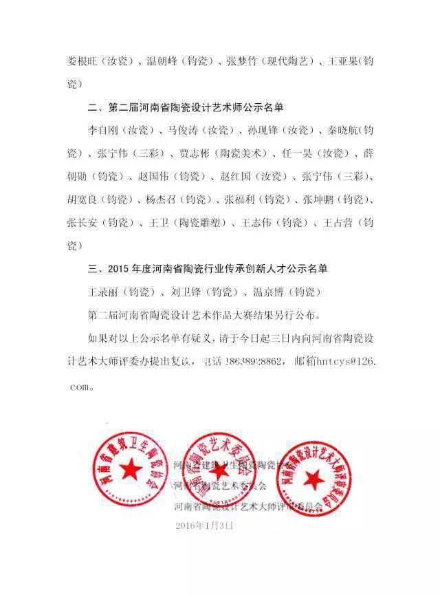 如果对以上公示名单有疑义,请于今日起三日内向河南省陶瓷设计艺术大师评委办提出复议,邮箱hntcys@126.com。