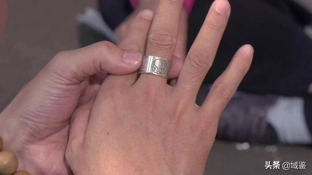 期间主播又从摊上拿起一个银戒指试戴,戒指上刻着“福”字和寿桃花纹,是常见的“三多”题材,象征多子、多福、多寿,寓意极好。