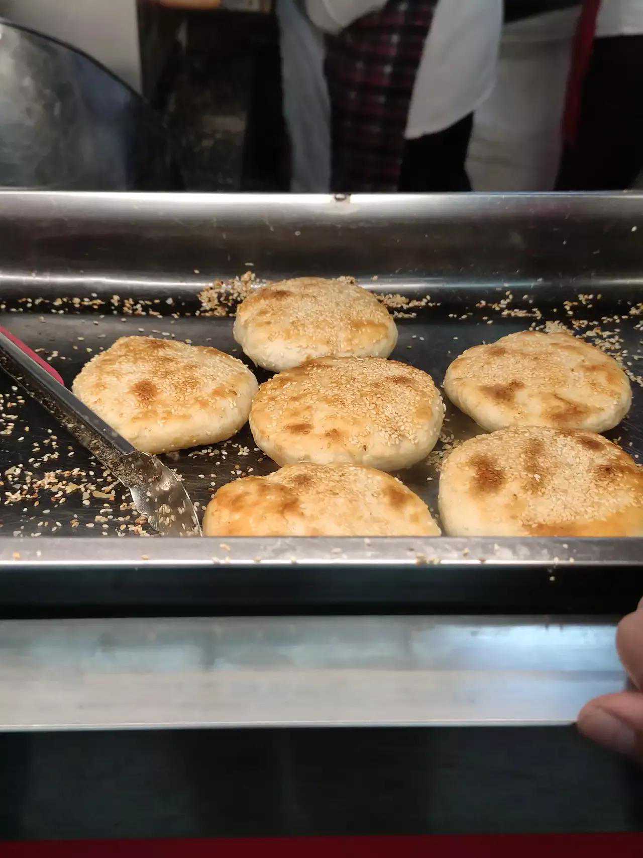 将食用碱用热水化开,分次加入发酵好的面团里揉匀,醒10分钟。揉成长条,摘成200个面剂子,每个面剂子包上油酥13克,擀成10㎝长,7CM宽的面皮,左右对折后再擀成面皮,然后由前往后卷起来,用掌心平摊成6㎝的圆形面皮,铺上猪板油8.5克,再加上葱油酥10克,封口。擀成小圆饼,上面抹一层饴糖,糖面乡下扣到芝麻里,然后装入烤盘进烤箱下层,3分钟后移到上层再烤2分钟就可出炉了