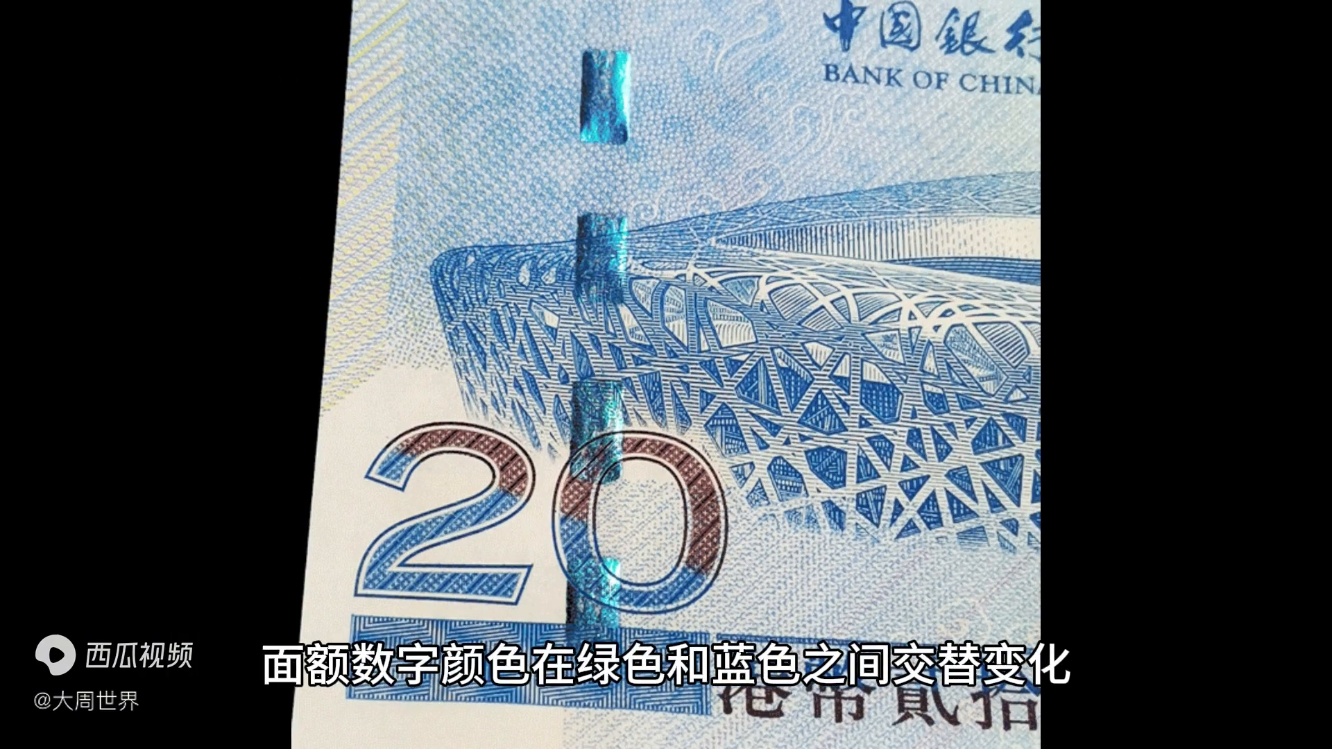 ·四是光变面额数字,正面中间面值20根据角度的不同有色调变化,垂直观察面呈绿色,中部有横向亮条,平视时呈蓝色。随着观察角度变化,面额数字颜色在绿色和蓝色之间交替变化,同时亮条呈现上下滚动效果。
