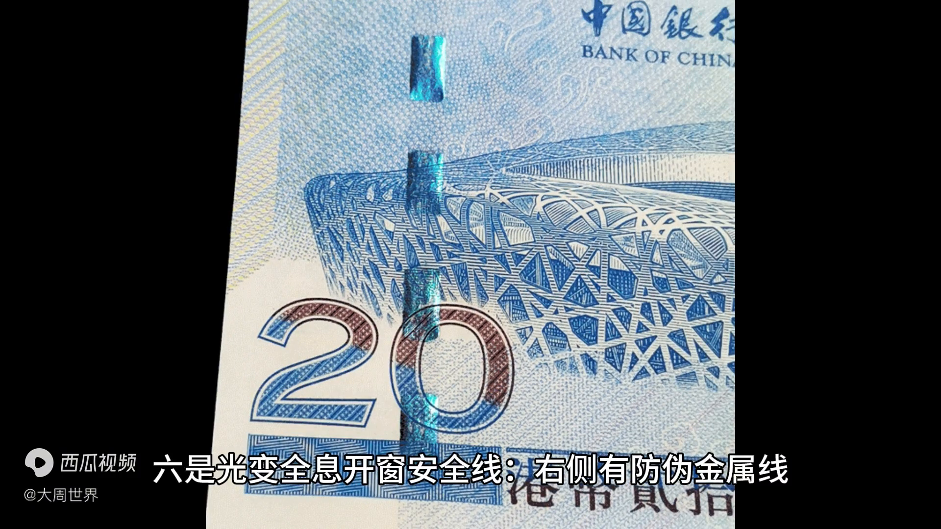 ·六、光变全息开窗安全线:右侧有防伪金属线,开窗部分有BeiJing2008字样,斜看钞票右边金属线附近三朵类似水印的银码紫荆花清晰可见。