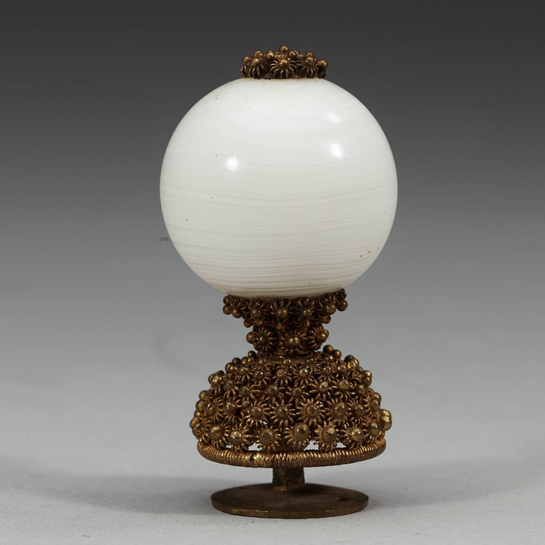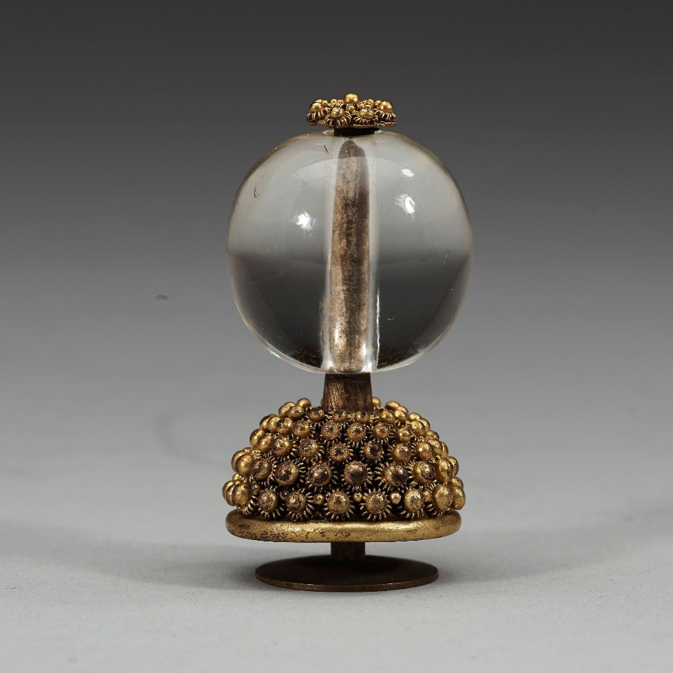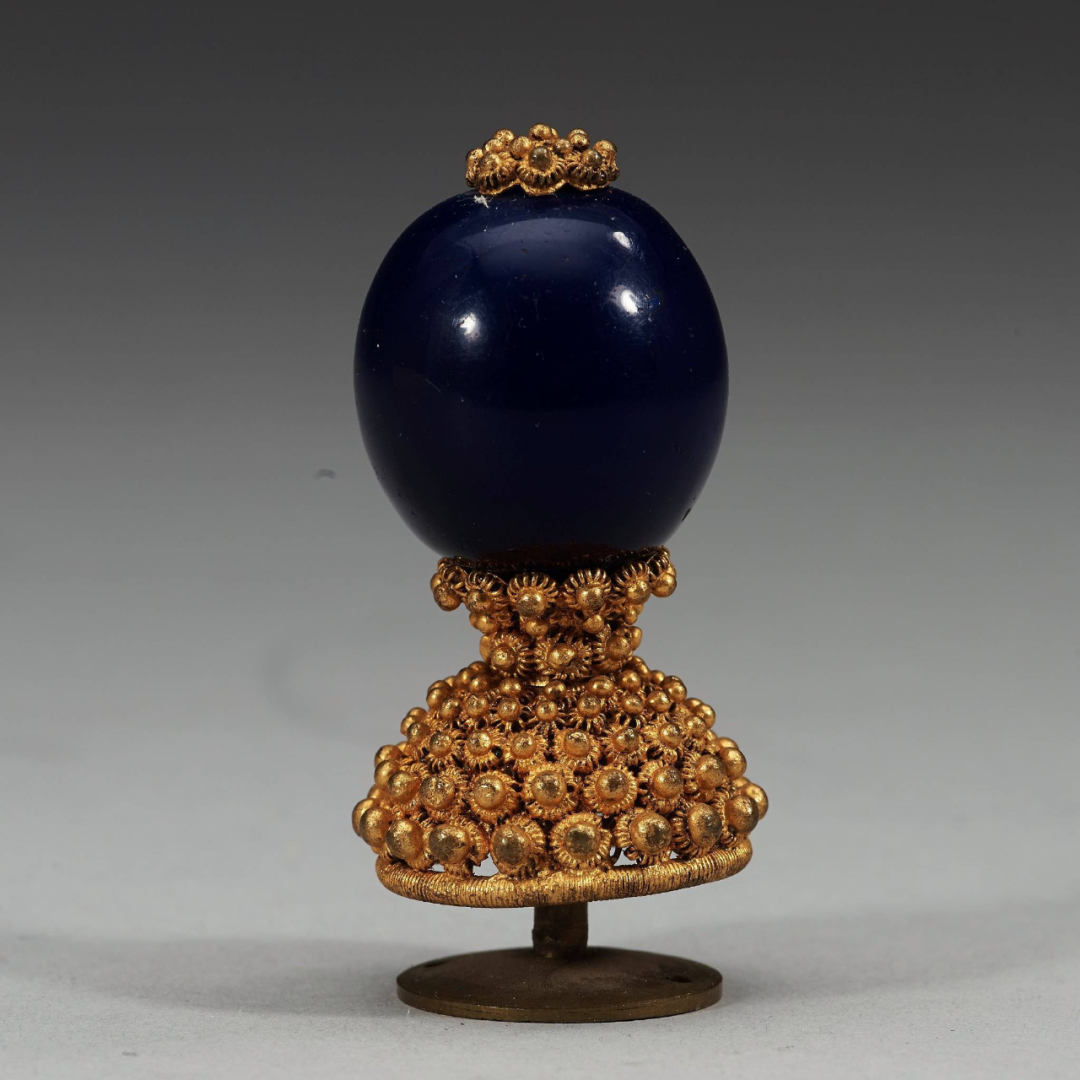 六品官员之后的七品及以下官员的顶珠用的是我们再熟悉不过的黄金。其中七品为素金,八品九品为镂金。素金就是全金,没有中空。镂金是内部镶金,并有花纹,八品是阴文,九品是阳文。