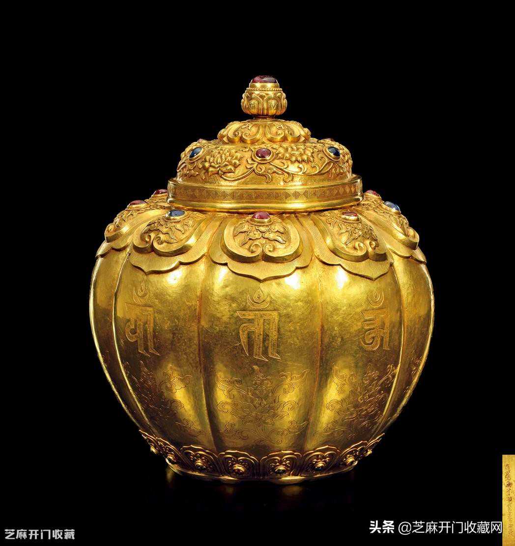 5:明宣德金嵌宝莲托梵文瓜棱盖罐,尺寸:高20.5厘米;重1455g,成交价:RMB34,500,000