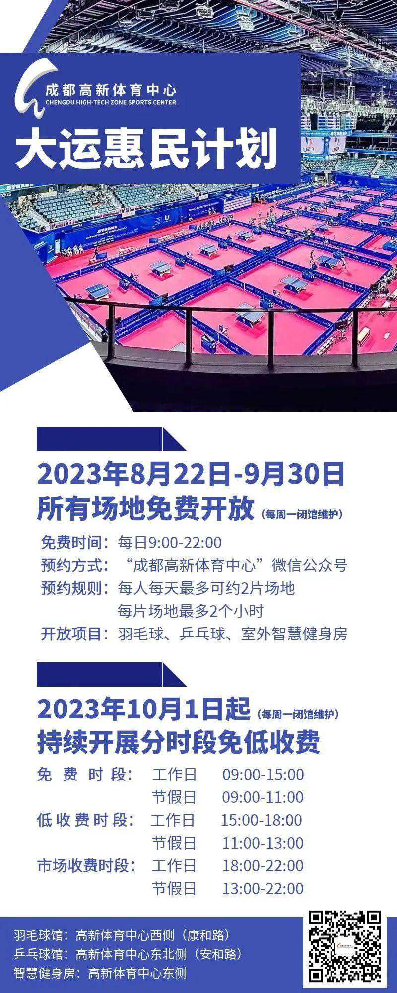 作为成都大运会期间举办乒乓球比赛同时兼顾训练需要的大型甲级场馆,成都高新体育中心近日发布大运惠民计划,在8月22日-9月30日期间,所有场地免费开放(每周一闭馆维护);此外,10月1日起,持续开展部分时段免低收费开放(每周一闭馆维护)。