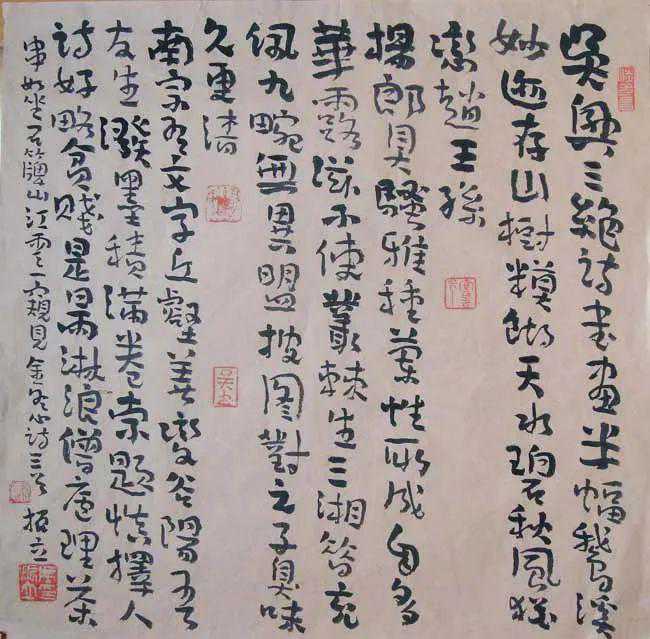 吴先生并不刻意追求风格上的不断“创新”,他的书风相对稳定,其变化是一个建立在逐渐丰厚积累上的、自然而然的缓慢进程。但吴先生绝不固步自封,绝不守旧。恰恰相反,对名利的淡泊,使吴先生可以持之以恒地执着追求自己的艺术理想,也使他成为一位当今难得的到了晚年还在求新求变且不断进步着的书家。只要浏览下他不同时期的作品,就可以得出这个结论。他近年的作品,个人风格愈加突出,内涵愈加丰富,也愈加烂漫、愈加自由、愈加深邃、愈加超脱,正在走向人书俱老的境界。我们有理由相信,这位在砚田辛勤耕耘付出了几乎整个人生的老人一定会收获更加丰硕的果实!