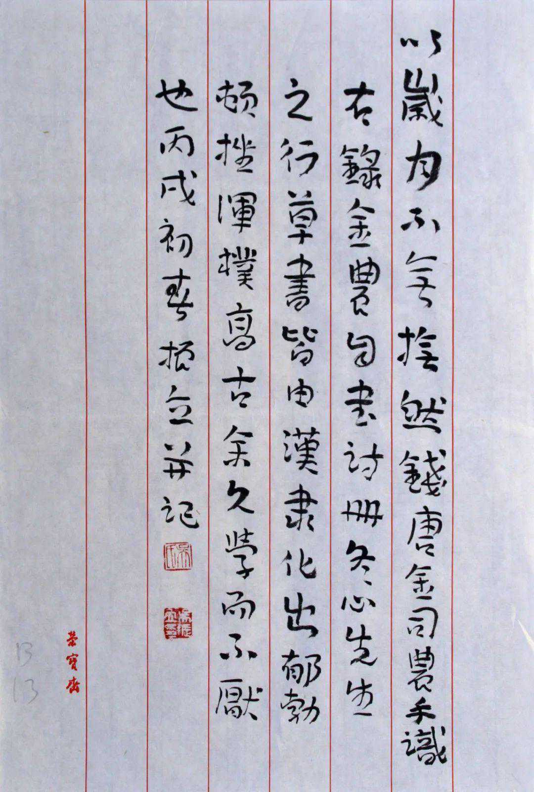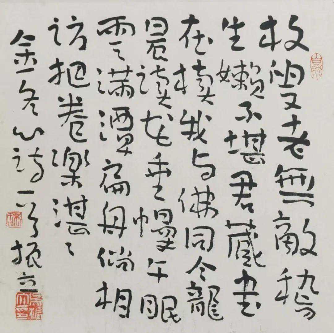 他们同是金陵书坛高手,于书法有一种源自骨子里的热爱。他们都插过队,经历过底层生活的磨砺,对书法的求索却矢志不移。他们于书法卓有建树,却并不追逐艺术之外的名与利,没有什么书坛体制内显赫的头衔,与“实”相比,他们的“名”远远不及,是反向意义上的名不副实。更可贵的,他们不染时俗,艺如此,人也是。他们在精神上是相通的。