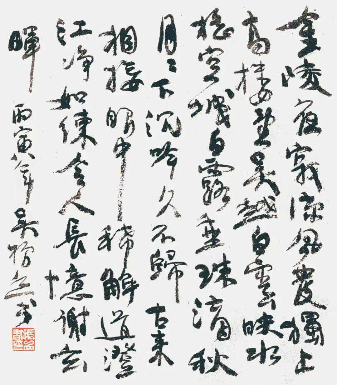 吴先生书法与乐先生书法的另一不同之处,就是他的作品之间没有让你无法预测的外在风貌上的巨大反差。吴先生作品的“这一件”与其他作品的不一样,是通过点画与结字的微妙变化实现的。这种变化,不仅产生了作品形态上的差异,也与作品的文字内容、情感表达相关联。