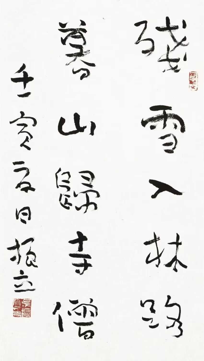 作为一位默默耕耘了数十年的杰出书家,吴先生的取法当然远远不止这几家。譬如他的作品里,还有着八大的古澹、弘一的静逸、汉隶的谨严、傅山王铎的缠绵,他也写东坡,写二爨……但如果说他功夫下得最深、对其书法风格的形成影响最大的前贤经典不出上述三家当不至于太离谱。