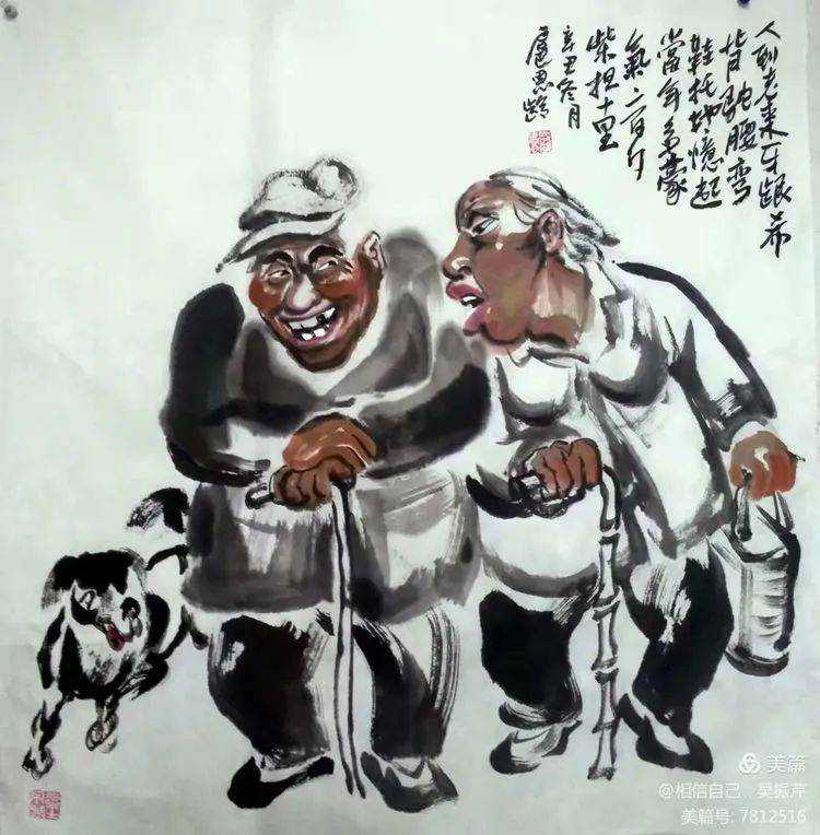 看他的画,文采斐然,神情毕肖,亦庄亦谐,谑而不虐,可谓匠心独运,炉火纯青。妙在雅俗之间,又在似与不似之中。虚虚实实,简淡从容,雕而不凿,含而不露,生动传神,耐人寻味,俨然大家手笔,可谓非同一般!