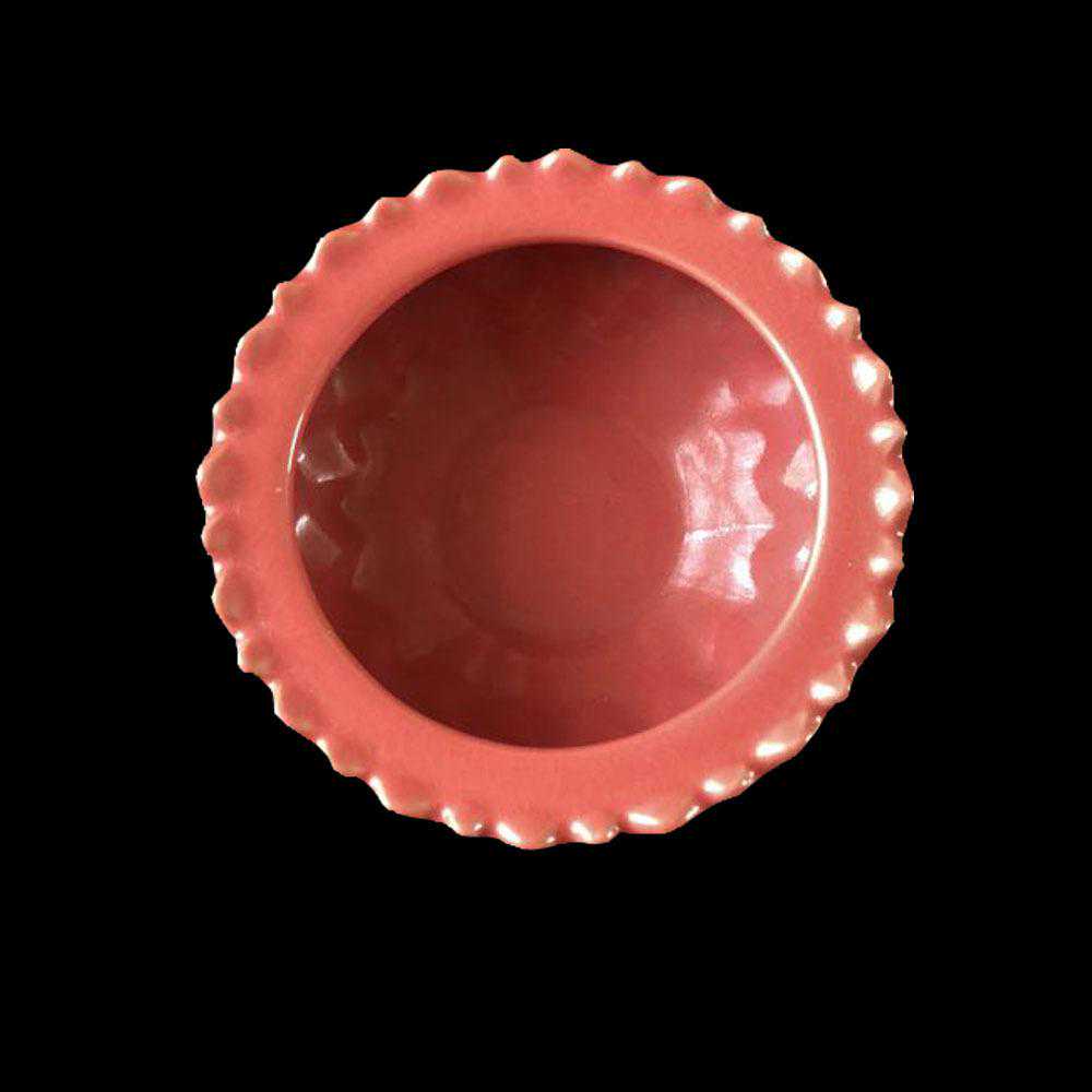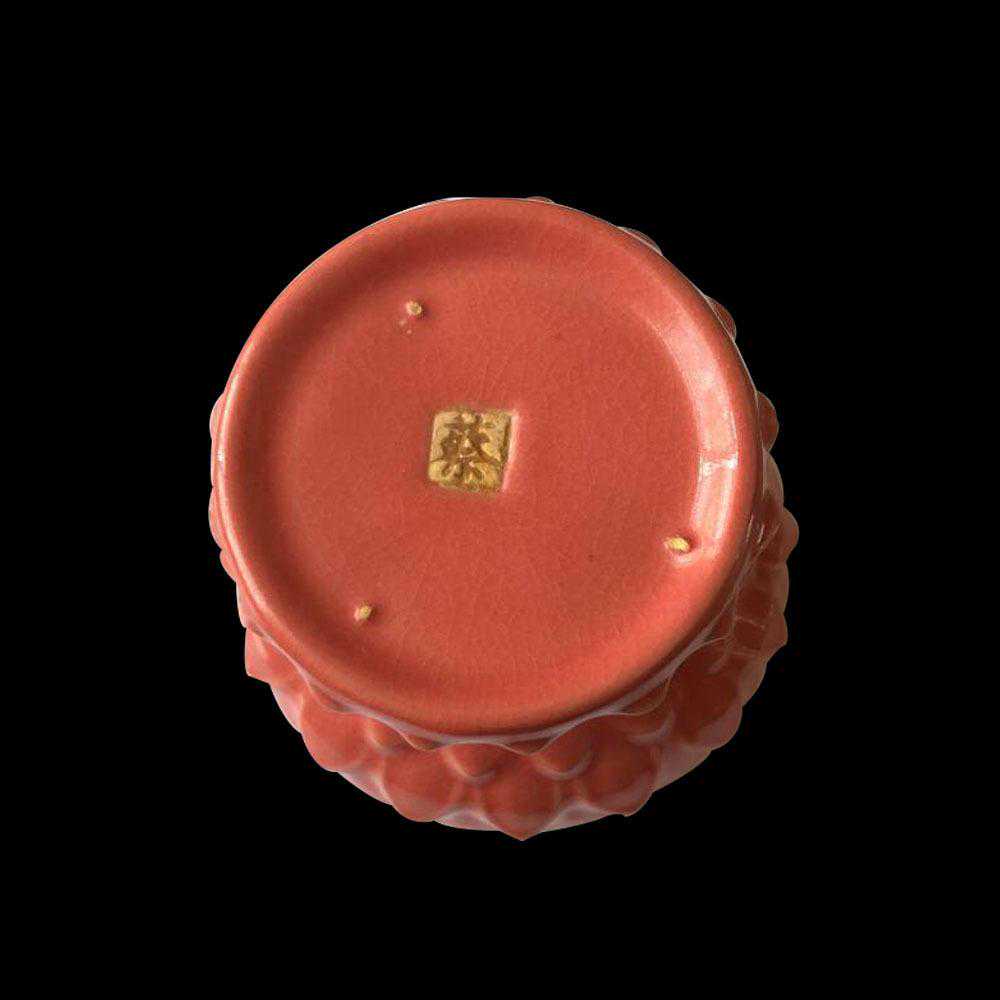 该瓷器釉色为珊瑚红釉,是一种低温铁红釉,它是将红釉吹在白釉之上,烧成后釉色均匀、光润,能与天然珊瑚媲美,故名“珊瑚红釉”,目前普遍认为纯正的珊蝴红釉诞生于康熙年间。此莲花瓣纹盏器形规整,釉色鲜艳、工艺精湛。