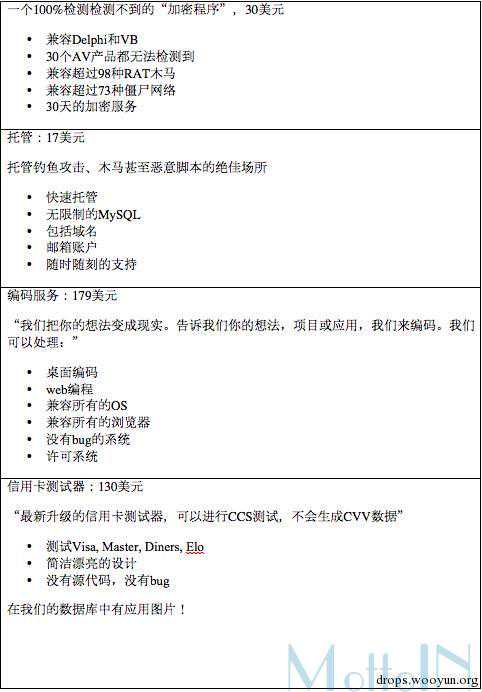 有些犯罪分子还开设了在线商店来销售他们的产品,更人性化地推广他们的服务。在这些商店中,你可以购买加密程序,托管服务,木马编码服务等。“BlackStore”(现在已经下线了)的目的就是这样。我们看看这些“商品”的价格: