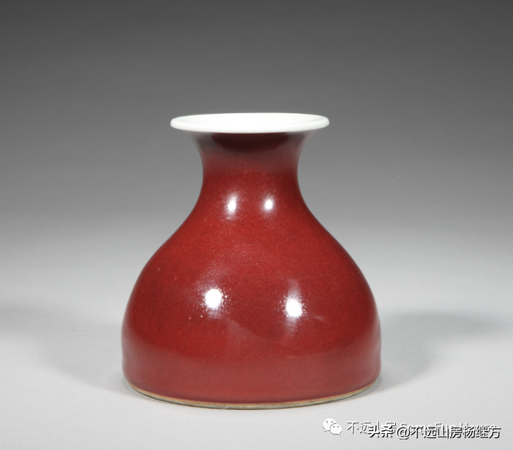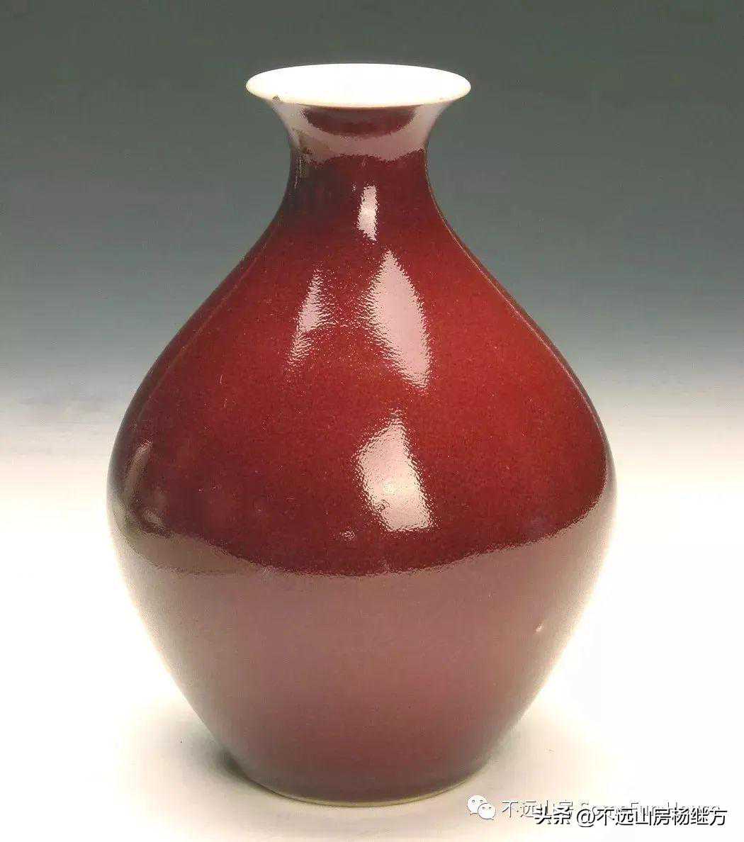 以铜为着色剂的高温铜红釉,元代已经十分成熟,“明永乐以鲜红为宝”,宣德年间的宝石红更胜一筹。有铜红、金红和铁红之分。铜红釉,又称祭红,是以氧化铜为呈色剂,在1300℃左右的高温还原焰气氛中烧成。对于烧造温度和窑内气氛的控制要求极严。历来是单色釉中烧成难度最高的品种。明宣德以后铜红釉的烧制几乎失传,到了康熙时又有了恢复和发展,至雍正这种名贵而难度极高的釉色才达到了最成熟的阶段,烧制出华丽幽静,失透深沉,呈色均匀的雾红器。