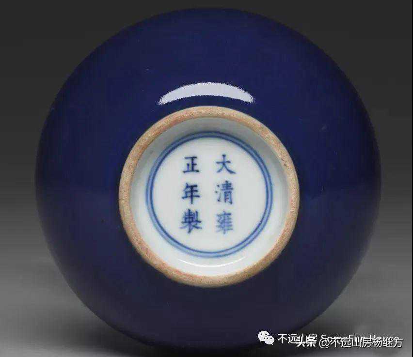 雍正的蓝釉有雾蓝、天蓝、天青之分,天青釉比之天蓝釉更浅色相呈淡蓝中微现青绿色,粉嫩柔和,似是仿宋汝釉而来。自宋迄明代有作者,至康雍集其大成,幽隽淡永兼而有之。宋瓷釉色纯净不事雕琢之美,蕴含中国传统的文人情怀。雍正皇帝深慕宋瓷的古雅气息,专命景德镇御窑厂以其为范本,制作了各种仿宋瓷器形和釉色的品种,宝爱有加,并以造型俊秀、釉色典雅、胎质坚致著称于世。雍正御窑仿官釉釉色有粉青、天青、灰白等色,釉面或有冰裂纹片,或无开片,部分器物亦有宋官窑器的“紫口铁足”特征。雍正祭蓝,旧称霁青。仿宣德宝石蓝釉烧制而成。这种失透、匀净、釉表布满橘皮棕眼的深兰釉,与祭红有相同特征,宁静肃穆,与天坛祈年殿上的琉璃瓦颜色一致,极适于天人相接的祭祀场所。雍正祭蓝釉造型有玉壶春瓶、胆式瓶、穿带瓶、折肩撇口瓶、圆洗、盆奁、茶壶、盖钵、高足豆、高足碗、大碗、盘、碟等,釉深浓沉静,厚而均匀,有里外蓝釉与里白外蓝两种,底均有青花六字双圈六字楷书“大清雍正年制”。清代皇室每年要祭拜京师的天、地、日、月、先农、先蚕、社稷诸坛,以及风、云、雷、雨诸神庙,还要祭拜皇宫内设置的家庙奉先殿;坤宁宫每年元旦,冬至,万寿之大节也要举行隆重的祭祀礼仪。祭祀时需要盛装牛头、羊头和牲畜皮毛和内脏,需要许多巨大的盘、碗。雍正祭蓝釉有一些胎厚体重的巨大的盘、碗是典型的祭祀用瓷。雍正的霁蓝釉,祭蓝是一种含百分之二左右的氧化钴的失透釉,在高温还原焰中烧成,色相沉稳肃穆,均匀滋润釉面有明显桔皮纹,与同期之霖红釉很相似。低温蓝釉在唐代已经普遍应用在唐三彩陶器上,而高温蓝釉器创烧于元代,是以适量天然钴料作为着色剂,在1280℃-1300℃窑内一次烧成的石灰碱釉,传世品不多,因而十分珍贵。明清两代在元代蓝釉的基础上相继创烧出霁蓝、洒蓝、回青、天蓝等新品种,主要造型都是祭器与陈设用瓷。据资料,雍正御瓷霁蓝品种,为仿宣德宝石蓝釉烧制而成,清宫旧称「霁青」。霁蓝釉色与天坛祈年殿瓦色一致,亦为「礼天」之器,气质极为尊贵。