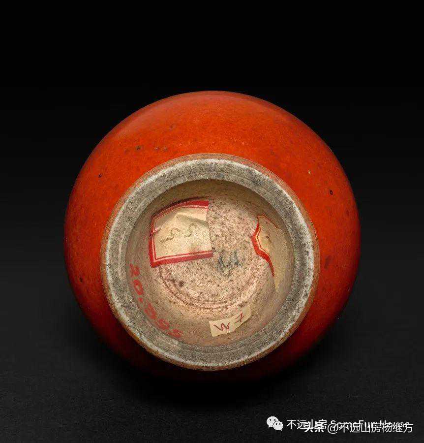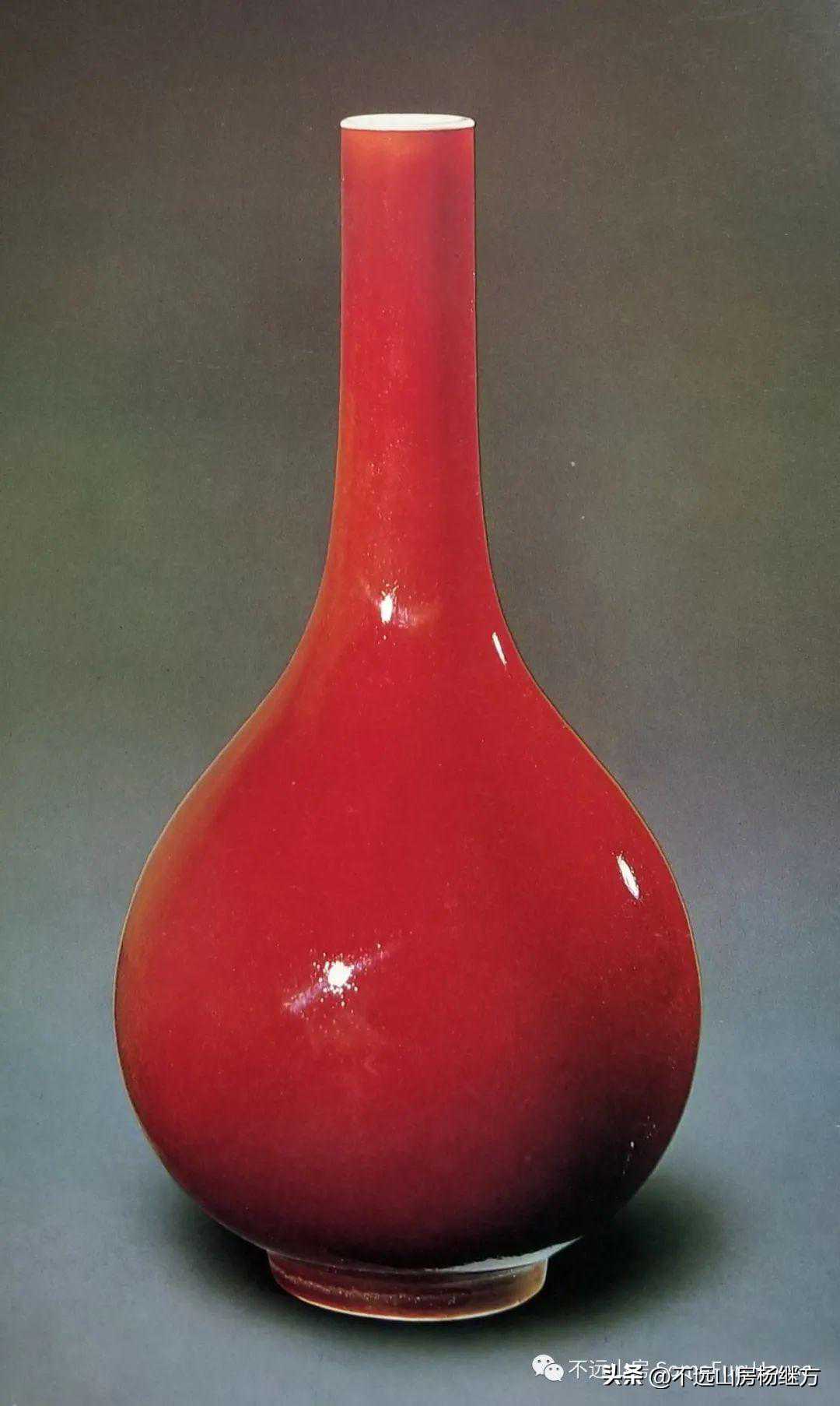 铁红釉,又称矾红、珊瑚红釉,是以氧化铁为呈色剂,在低温氧化气氛中烧成的一种微带橙黄的砖红色釉。雍正时的珊瑚红器釉层薄透而均匀,有明显桔皮纹色调沉着光润精美,呈现出富丽堂皇精致典雅的宫廷气象。珊瑚红釉是康熙时期创烧的低温彩釉,以铁为着色剂,因其釉色红中闪黄,色如红珊瑚而得名。此品颈部细长,器形秀美挺拔,如美人娉婷婀娜,全器满施珊瑚红釉,釉色细腻匀净,鲜艳纯美。《陶雅》谓之“华贵中之佚丽者也..匀净明艳,殆亡伦比。紫晶逊其鲜妍,玫瑰无其娇丽。”胭脂红虽然在康熙中早期就传入景德镇御窑厂,但是由于科技含量较高、造价较昂贵,直到康熙末期也没有被御厂普及使用。雍正中后期,由于御窑厂制瓷的发展革新,胭脂红逐渐推广使用至众多彩瓷领域。