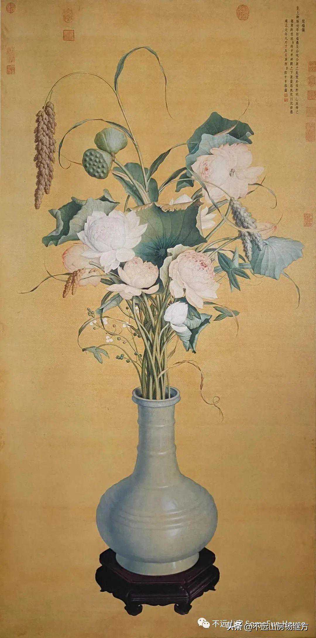 很多宫廷绘画都反映了雍正帝的好古趣味,郎世宁为庆祝雍正改元所绘的《聚瑞图》便是其中一例。《聚瑞图》的绘画主题中出现了南宋官窑青瓷弦纹瓶,瓶中插莲花。