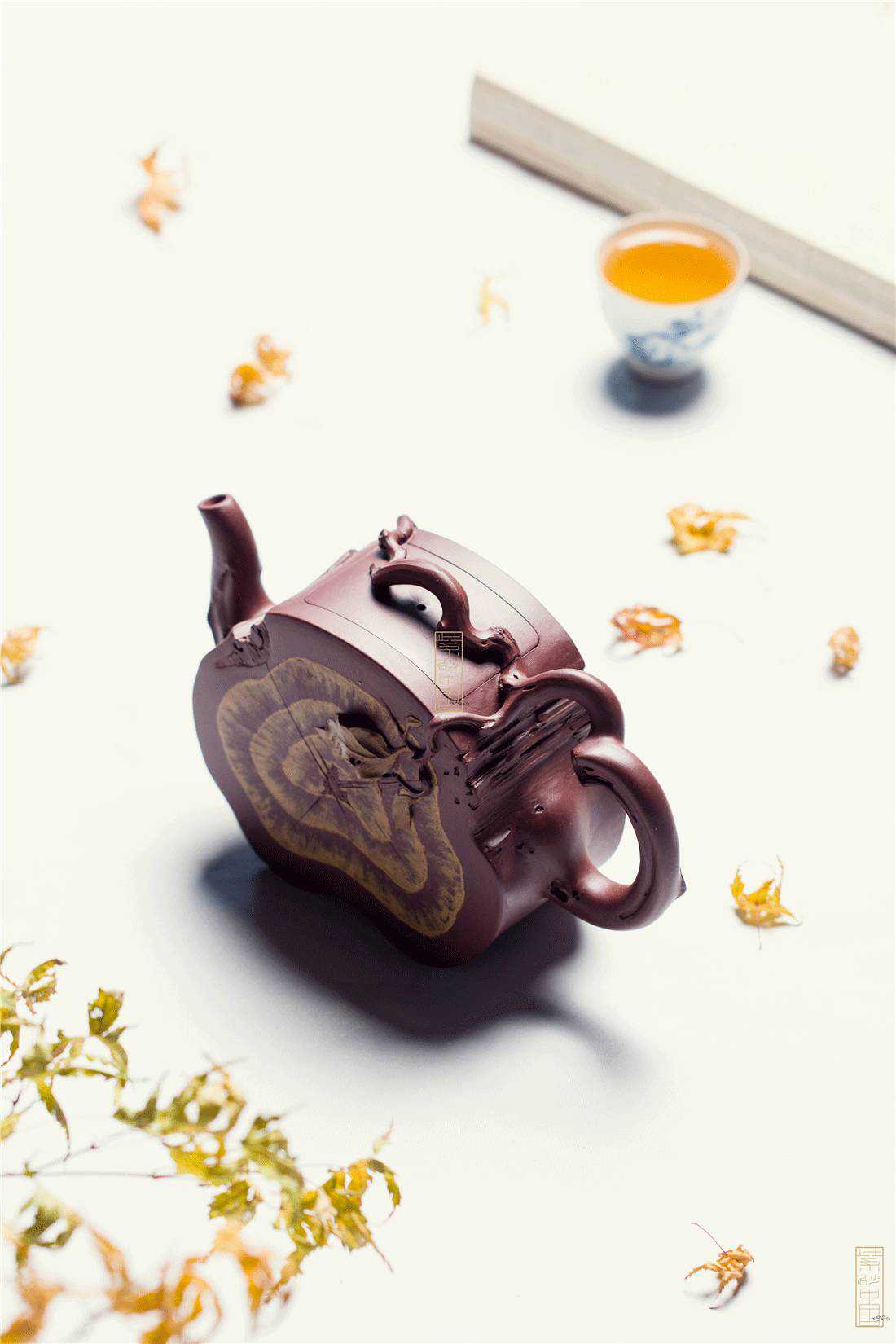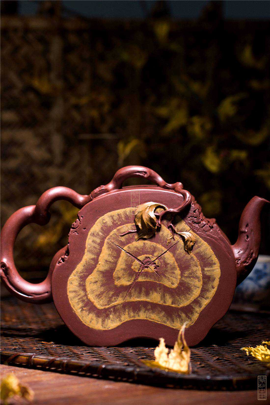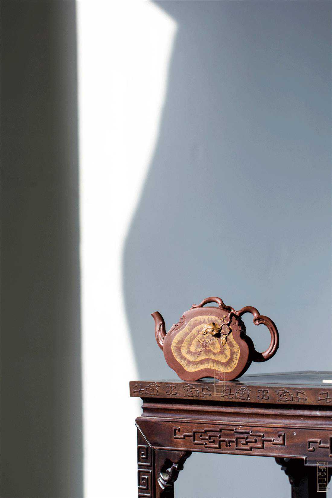 皴裂斑驳,伤痕累累的细节被刻画的惟妙惟肖,壶把作扭曲的枝节状,从壶腹延伸至壶盖,落脚在壶身,增强了视觉上的延伸感。