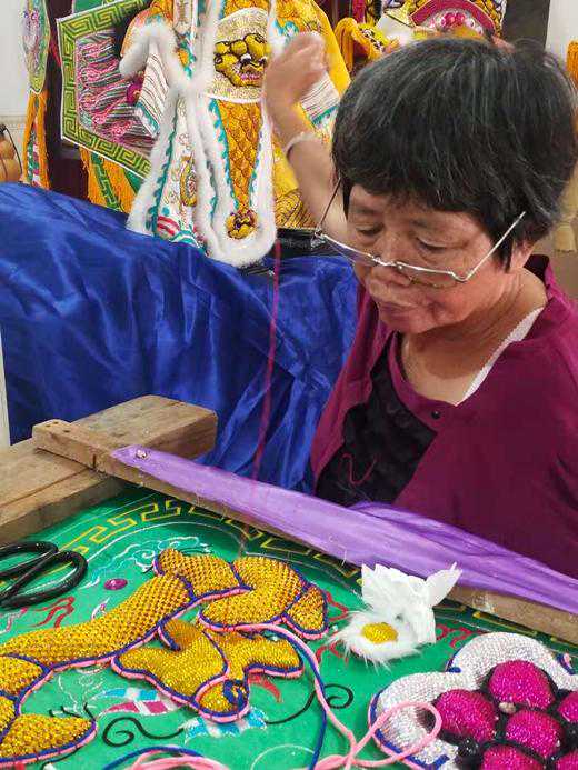 黄小明介绍,随着社会发展,耗时耗力的“金苍绣”一部分底花和简单刺绣不得不改用电脑刺绣,剩下的再经手工刺绣。比如绣一条龙,改良后的浮雕是先用泡沫雕刻出龙的形状,再粘上带有鳞状的金银布。经过绣工们一针一线的缝制和修饰,原本只是初具模型的龙浮雕顷刻如一条神龙跃然锦上。传统的金苍绣浮雕和改良后的浮雕成品看着差不多,但耗时却是改良后的好几倍。