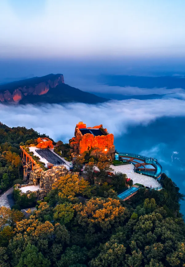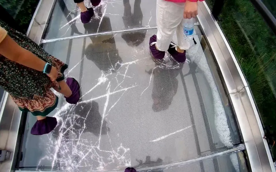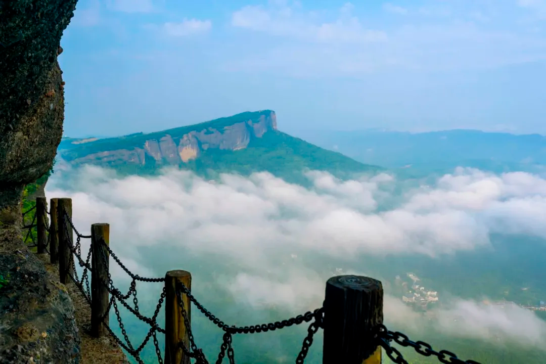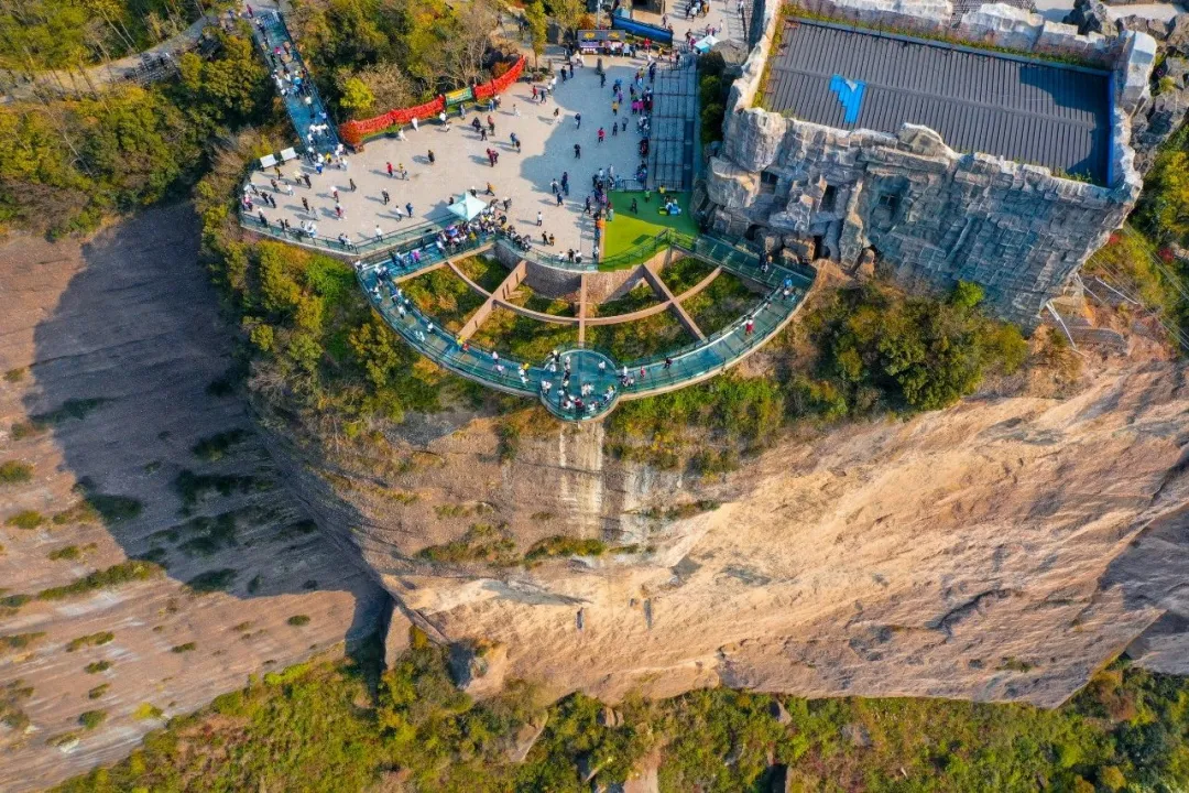 悬空玻璃观景台悬挂在峭壁之上,云自脚下起,雾从身边来,给人置身于虚空中的错觉。