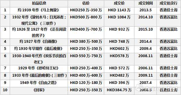 2014年此前流拍的《自画像》于香港苏富比重新上拍,748万港元的成交价足够令人满意。同年秋拍,与《工业之轮在纽约》同期创作的《旋转木马;日光浴者;现代公寓(三联作)》释出于市场,1084万港元的成交价同样不菲。2015年亦有创作于1927年的《正在阅读的男子》以932万港元成交。