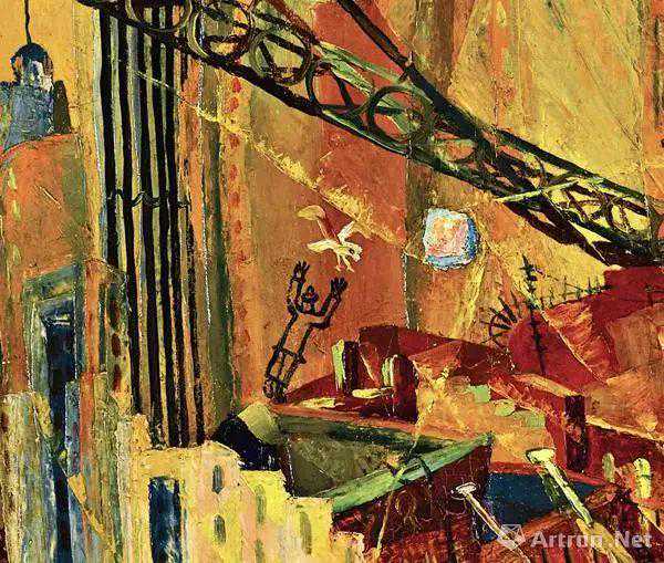 在这6周里,朱沅芷谢绝了一切访客,把自己关在房内,每天废寝忘食,仅靠大量白酒来支撑体力,才终于完成了两幅标志其艺术巅峰的经典:一幅是三联屏《旋转木马;日光浴者;现代公寓》,而更重要的一幅,便是《工业之轮在纽约》。