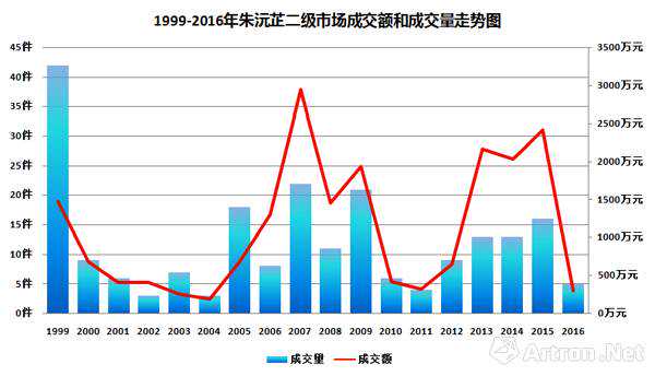 1999-2016年朱沅芷拍卖成交额及成交量统计表