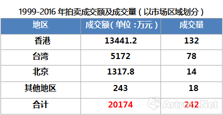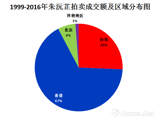 1999-2016年朱沅芷拍卖成交额区域分布图