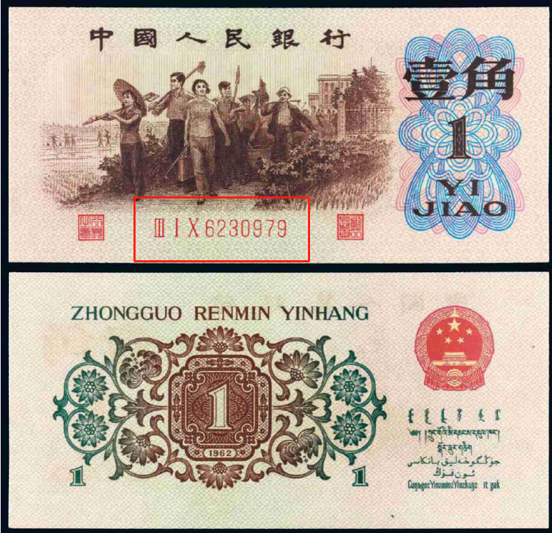该版本采用103-2号星水印钞票纸印刷,这种印钞纸是早期国产满版水印纸,水印图案模仿自苏联进口的特1号水印纸,产量不大,仅用于印刷部分1960年版和1962年版壹角纸币,因此造就了背绿水印壹角三版币“龙头”的地位。