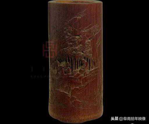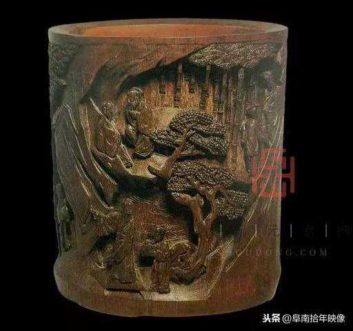 圆筒形,近底足处台阶外撇。以“竹林七贤”为题材,工艺技法上深受竹刻艺术大家“嘉定三朱”的影响,沿用了“三朱”常用的隐逸高士题材。