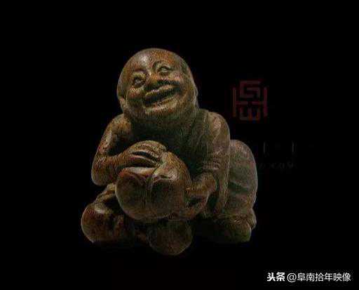 竹根圆雕小摆件。利用竹材根部厚实致密的特性,极其细腻传神地刻画出一个憨态可掬的童子形象;怀抱一枚硕大仙桃,笑容灿烂,神态逼真。