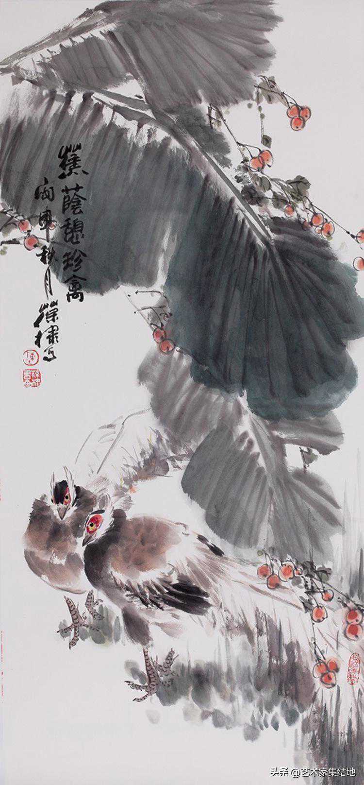 画面一黄鸡啄黍,悠然自得,右侧以修竹、山石和一棵参天大树为衬托。
