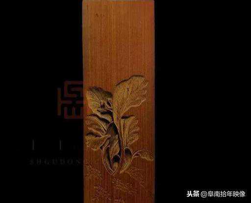 此器采用陷地深刻技法,将白菜全部刻陷地章之下,落刀富有层次,最深处在菜心。作者以对比体现美感,白菜的深浅、大小、阴阳、浓淡、动静、燥润以及整体构图的紧密与疏阔形成鲜明反差,加上以棕色的臂搁地章为映衬,更见白菜之栩栩如生,鲜灵活现。但整器色泽尚浅,欠滋润,刀工略显疲软拖腻,已显现出清晚期竹刻艺术下滑走势.