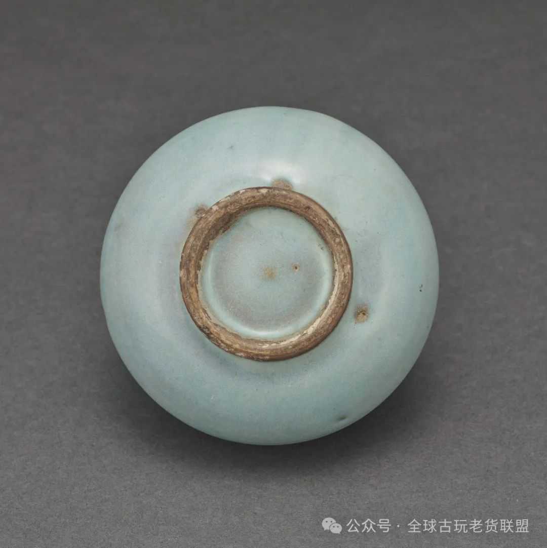 临汝窑以青瓷为主,兼烧白地黑花、天目、酱釉、三彩、钧釉等,其中青瓷主要为豆青釉和天蓝釉素器,多为生活用具,亦不乏陈设和文房器。此件即典雅的文房器,平面呈六瓣花式,侈口斜壁深腹,圜底承圈足。通体施青釉,足底露出白色胎骨,修刮规整。临汝窑作品秀丽灵动,简约古朴,方寸之间意境无限,本件即为典型。