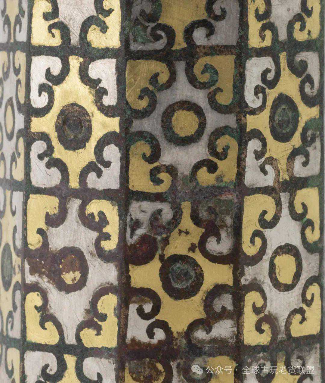 青軎自商代晚期出现,直至西汉前期,逐渐被铁軎取代。殳是一种用于撞击或前导兵器,尺寸甚长,头部以青铜铸造,平面呈圆形或多棱形,有棱无锋,柄采用木或竹制。此殳基于軎而出,平面八棱形,前窄后宽,顶端尖锐。顶面四棱面各划分八格,采用错金银装饰卷云纹。云纹布局于方格四角,或外金内银,或外银内金,形成四方连续交错排列,精美华贵。