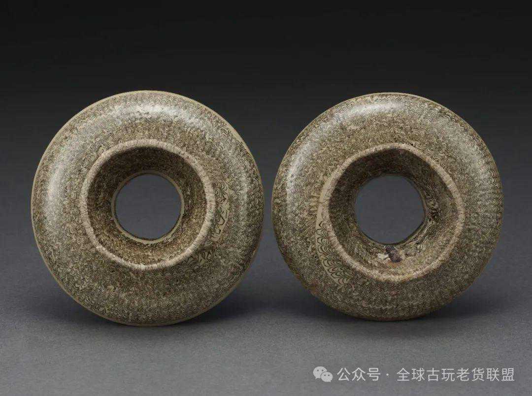 绞胎瓷是唐代开始出现的陶瓷装饰工艺新品种,北宋时期,当阳峪窑将唐代巩县窑的绞胎工艺发展到了顶峰。此对盏托即是当阳峪窑所制,形制相同,直口圆腹,收束底足与盘口相通。盘侈口浅腹,下承外撇的高圈足。除托碗束足、盘沿呈白釉外,其余满工装饰绞胎纹。部分绞胎若翎毛翅羽,条条束束,波曲交织,部分若清波水流,回旋涌动,其万千变化之态令观者赏心悦目。