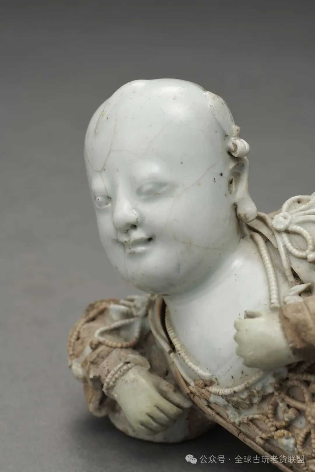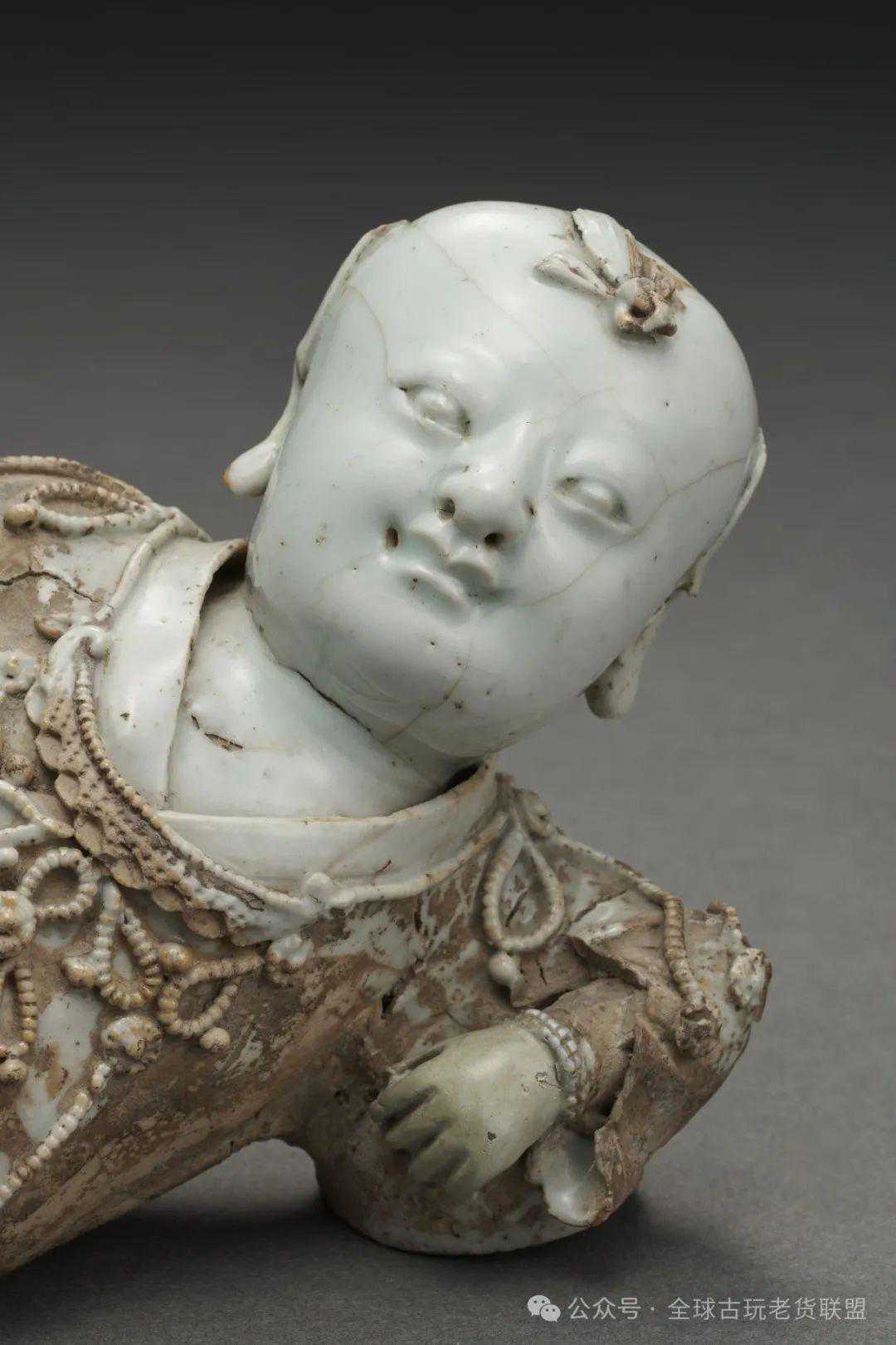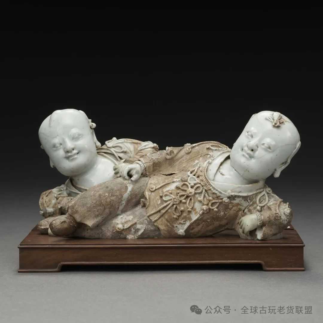 此童子一组两件,左右一对,形制相同,姿态稍异。其一童子左侧而卧,左臂蜷缩支体,两腿一收一伸,右臂轻搭右腿。另一童子右侧而卧,右臂弯曲撑地,左手拉扶衣襟,双腿微屈相迭。两童子均身着宽衣,披挂项圈璎珞,侧颈前望,双目圆睁,笑容绽放。其面容丰满圆润,头顶发髻,双耳厚实,一派恬静纯正的神态。童子的面部、胸口、双手施青白釉,塑造肌肤洁白柔嫩之态,其余露出胎骨,用以表现服饰的色泽质感。