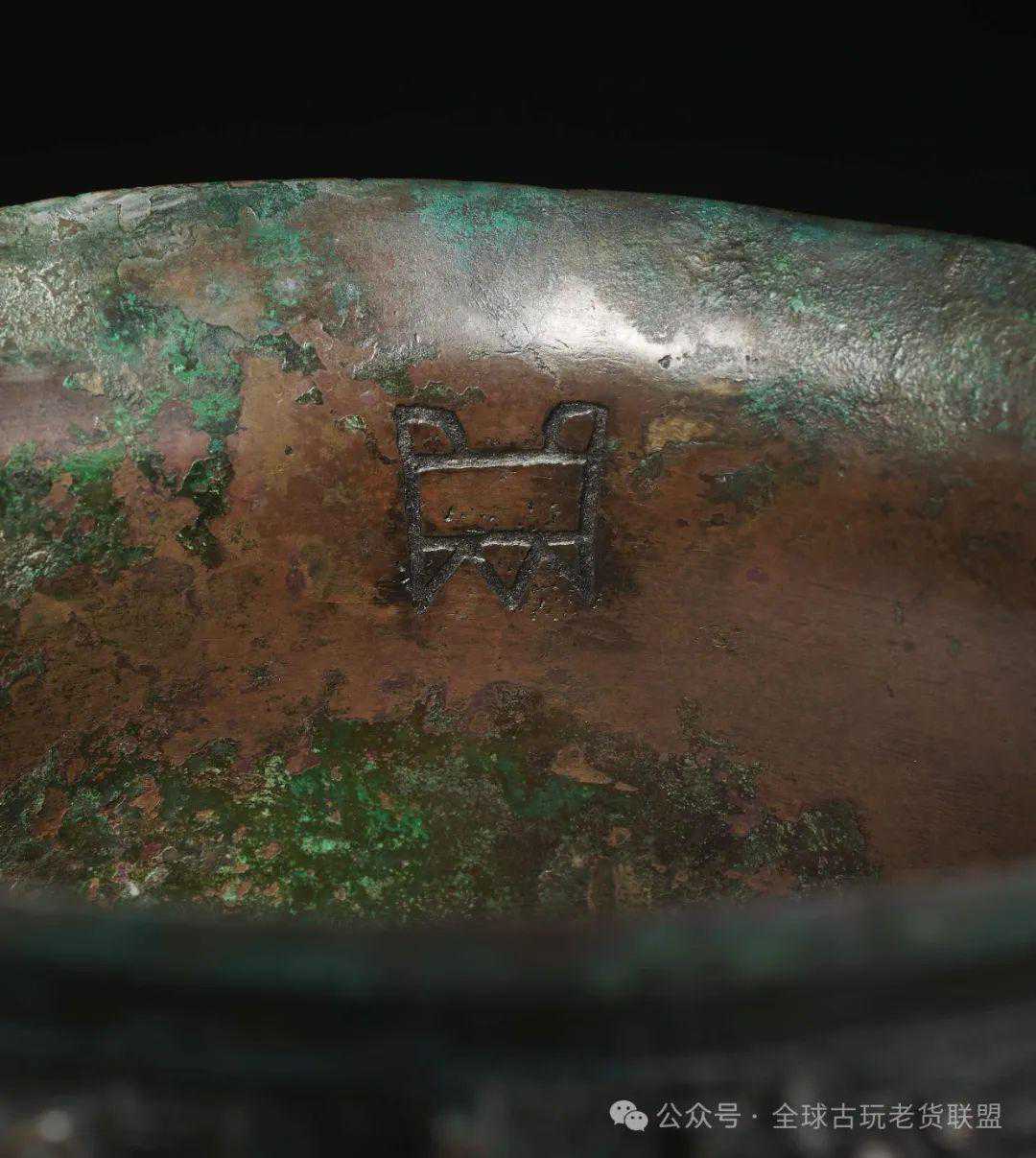 字,为族氏金文。宝鸡凤翔县先周墓曾出土有鼎族分裆鬲鼎,斗鸡台也曾出土一大一小两鼎卣,可见鼎族的居住范围位于宝鸡一带。本件器形周正敦厚,铸造工艺精湛,尺寸虽不大然体量厚重,为商代晚期同类之翘楚。