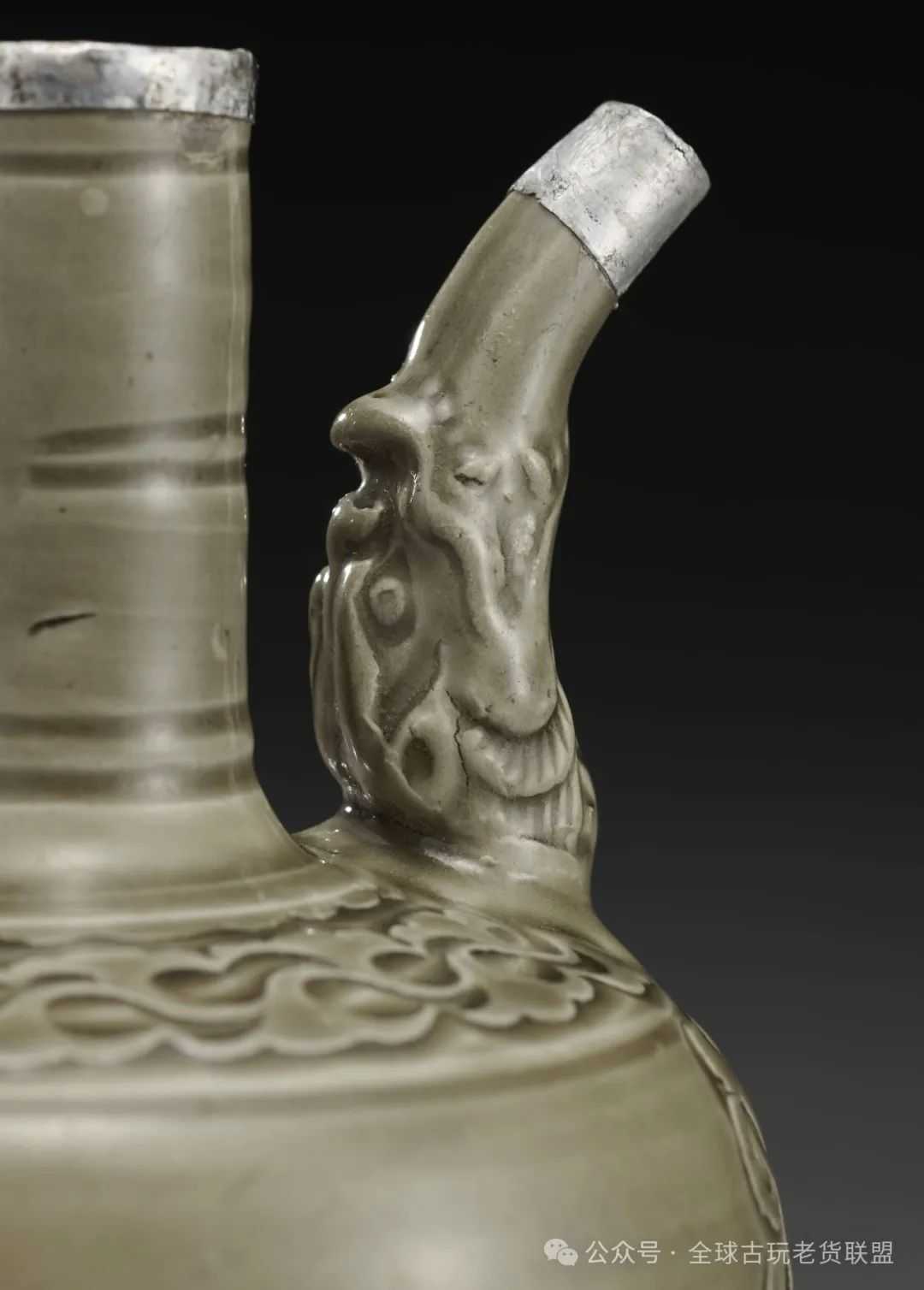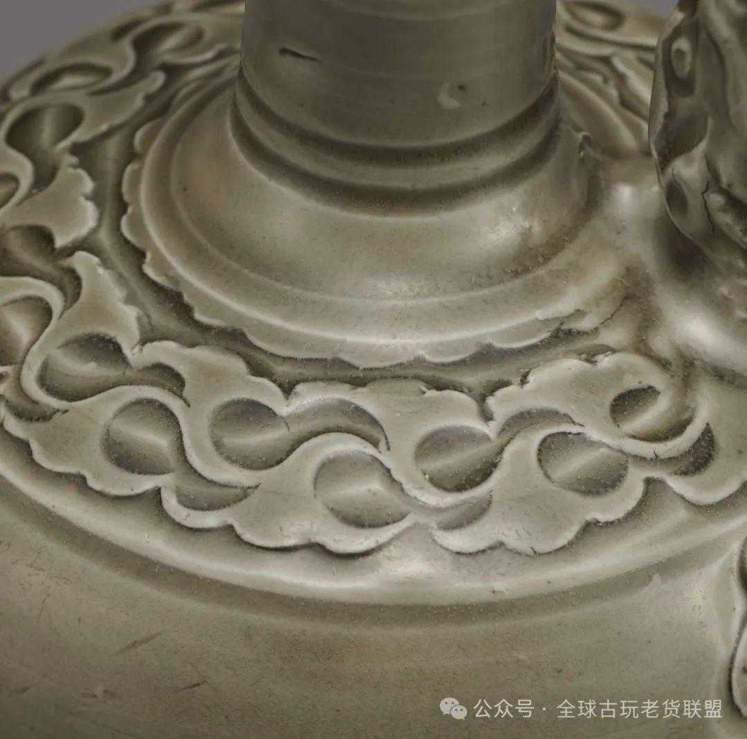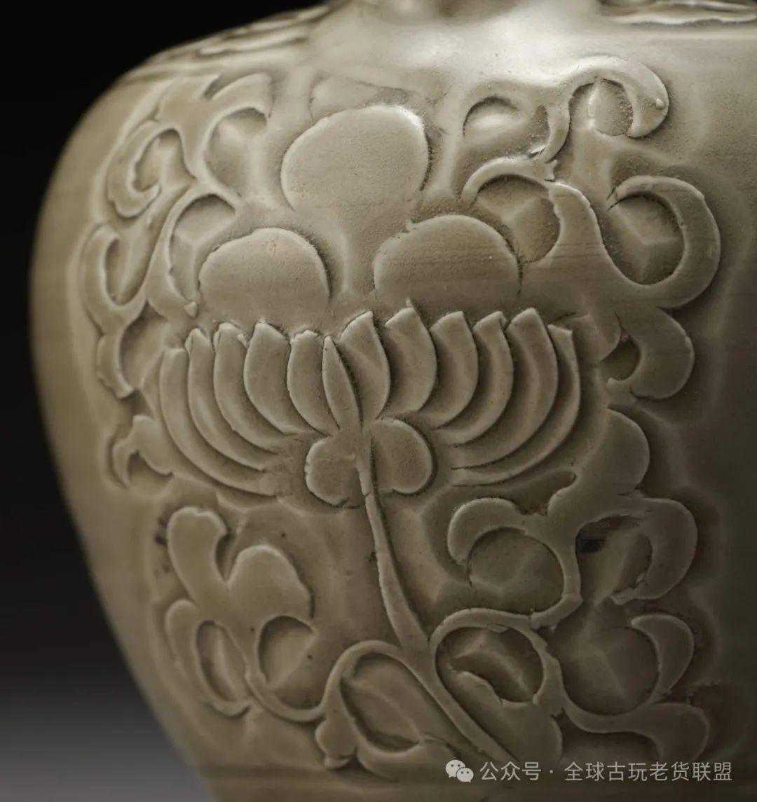 此件执壶长颈圆肩,前设长弯流,后置耳状鋬,圆鼓腹,下连外撇厚圈足。通体采用刻花工艺装饰:颈部分三段共饰五道弦纹。流口浮雕龙首,流腹交接处的腹前,剔刻一朵硕大的莲花,缠枝蔓蔓,延伸满布壶肩。壶鋬作两圆线相并,若两根莲茎。通体施青釉,绿中泛黄,刻花刀口处积釉稍厚,形成浮雕晕染的三维效果。耀州窑位于陕西省铜川市黄堡镇,创烧于唐代,成熟于五代,以青瓷闻名于世,北宋时尤以刻花技法最为主流,此件执壶正是这一时期的产物。