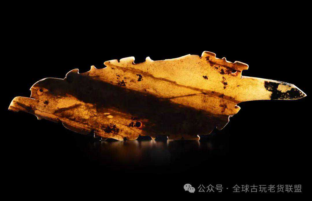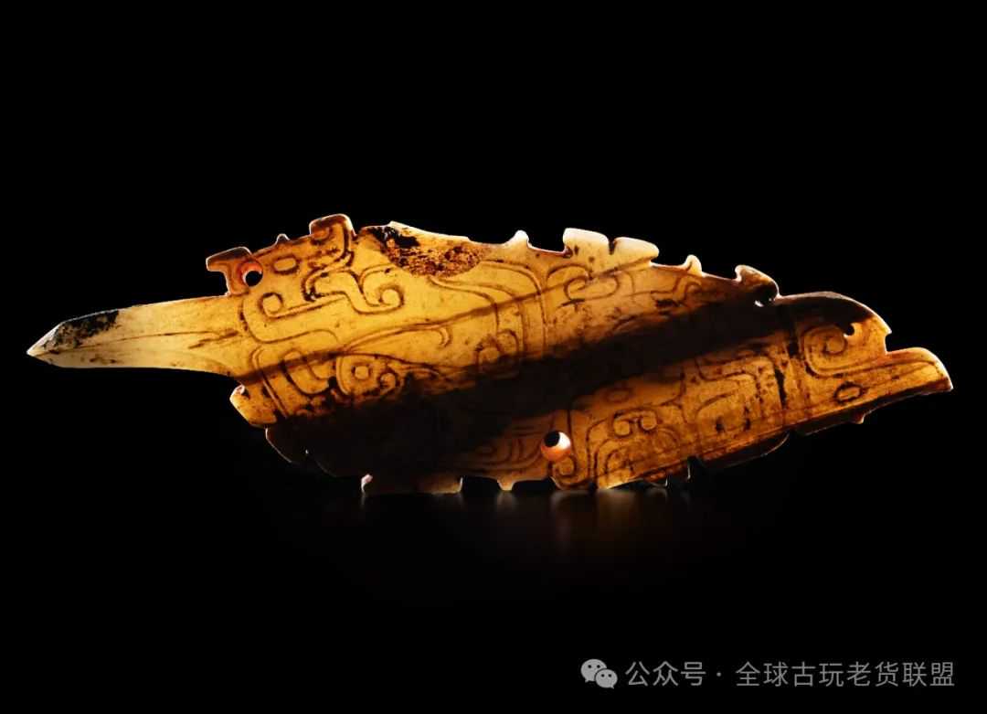 此件玉觽粗端硕大,其上打孔用以佩戴,尖锐部甚短,已完全变成装饰佩玉。粗端单面施刀,巧妙地融合龙纹、凤纹、神人图案于一身,采用一面坡、双阴线阳纹等技法,刻画轮廓线条,在平面上塑造出物象的立体感,是典型的西周玉作特征。整器纹饰繁复,同类中罕见,是难得的西周佩玉精品。
