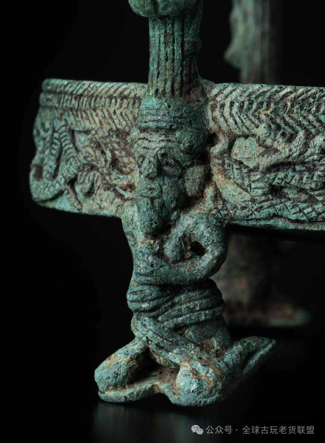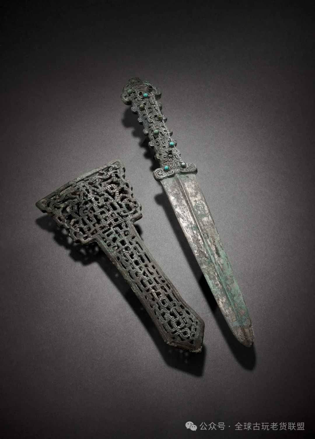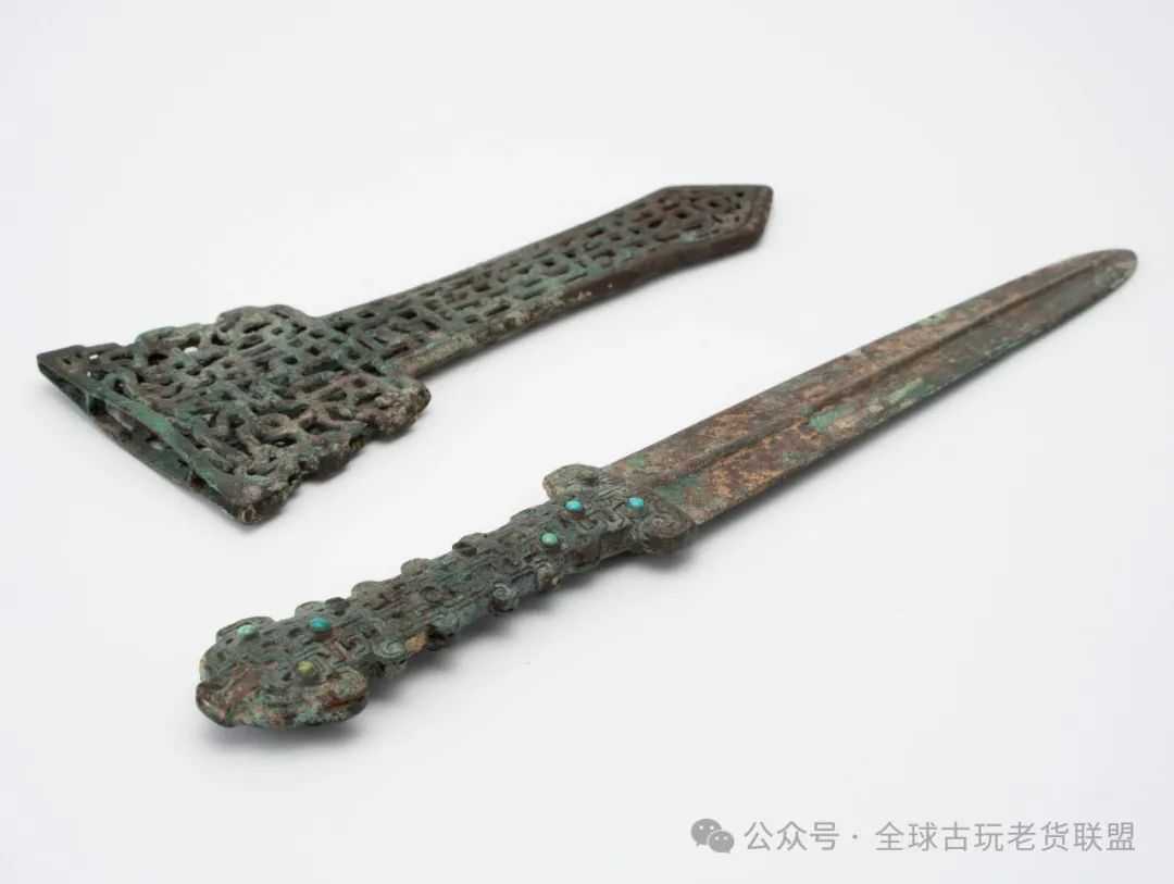 青铜剑很可能源自北方游牧民族,西周早期传入中原。春秋和战国时代,中原各国流行尖棱脊圆茎剑,而此时的内蒙、河北等地,多流行鄂尔多斯式青铜剑,其中脊常呈圆凸状,剑鞘常呈镂空状,装饰几何纹、缠绕的龙蛇、人物或马牛羊等畜类。本件青铜剑结合中原和游牧地区铜器风格,采用春秋战国之际流行的交体龙纹,辅以当时高级贵族常用的镶嵌绿松石工艺,完整一套,极为难得。