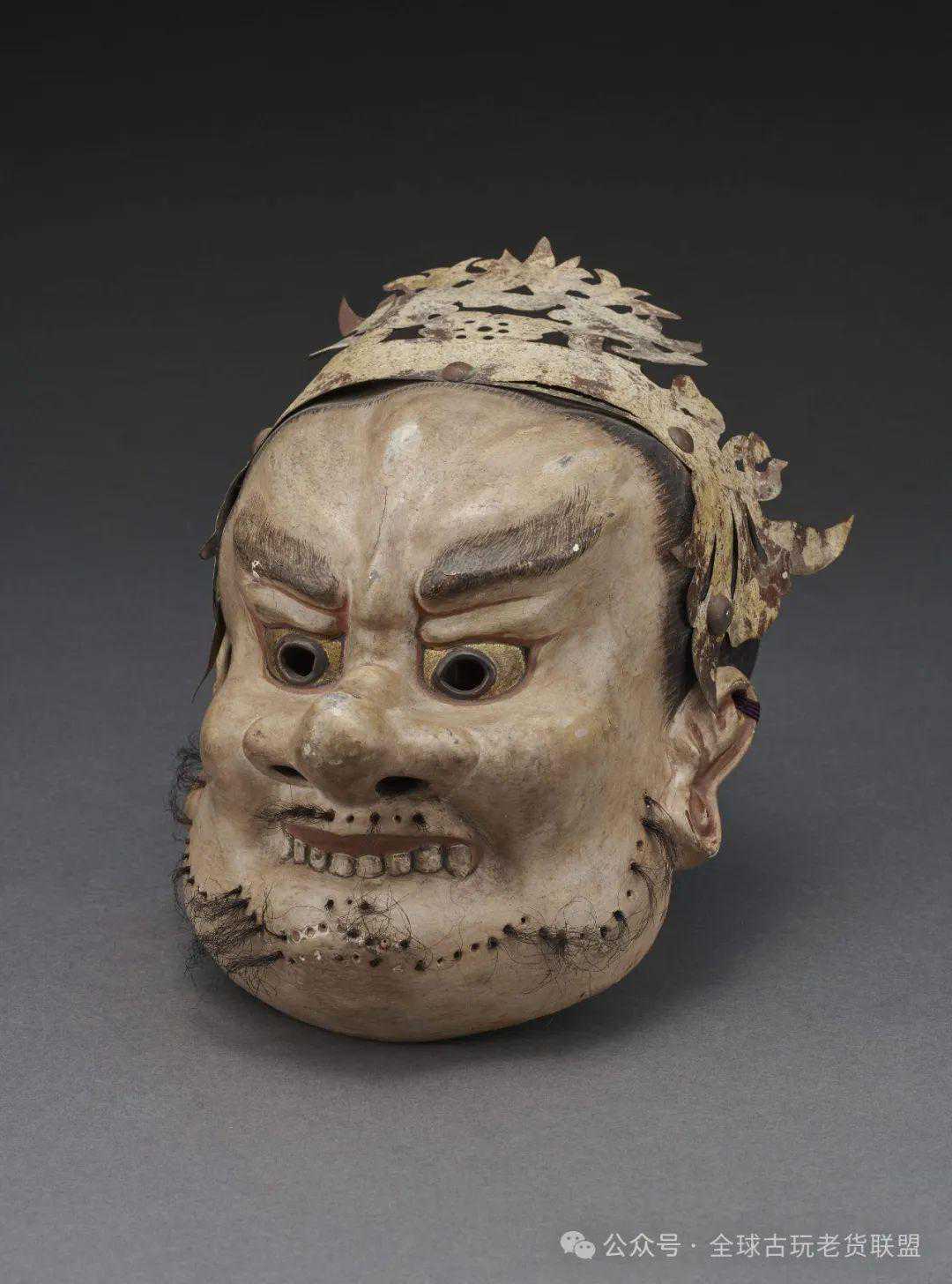 此件傩仪面具以木为胎,随类赋彩,以各色漆髹饰一力士之容。力士头戴金色冠,发髻高盘,倒八字眉粗壮,眉头紧锁怒目而视,颧骨突出,短鼻高翘,大耳低垂,上唇微启,排牙外露。唇须络腮胡以毛发植入,惟妙惟肖栩栩如生。面具双目、鼻底开孔,颅顶覆盖后脑,双耳穿绳用以佩戴。