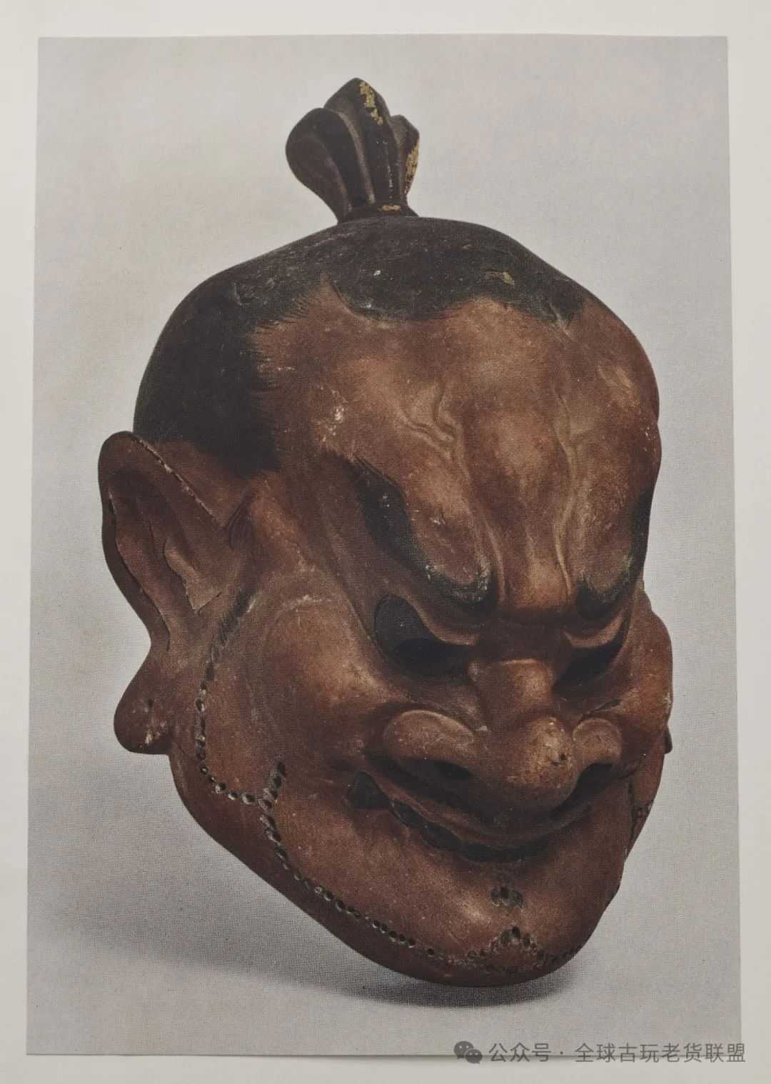 “傩”是兴起于先秦时代的驱邪逐疫、禳凶纳吉的仪式,主持者称为“方相氏”,头戴面具,手持竹竿或兵器作驱除击打瘟疫鬼祟之状。至唐代,除夕之日更要进行“大傩”的祭礼。傩仪面具形式多样,最初多鬼魅、动物,佛教的兴盛将天王力士的形象引入古老的傩祭之中。日本正仓院保留有唐代力士傩仪面具,与本件的做工、漆色相类,可为参照。