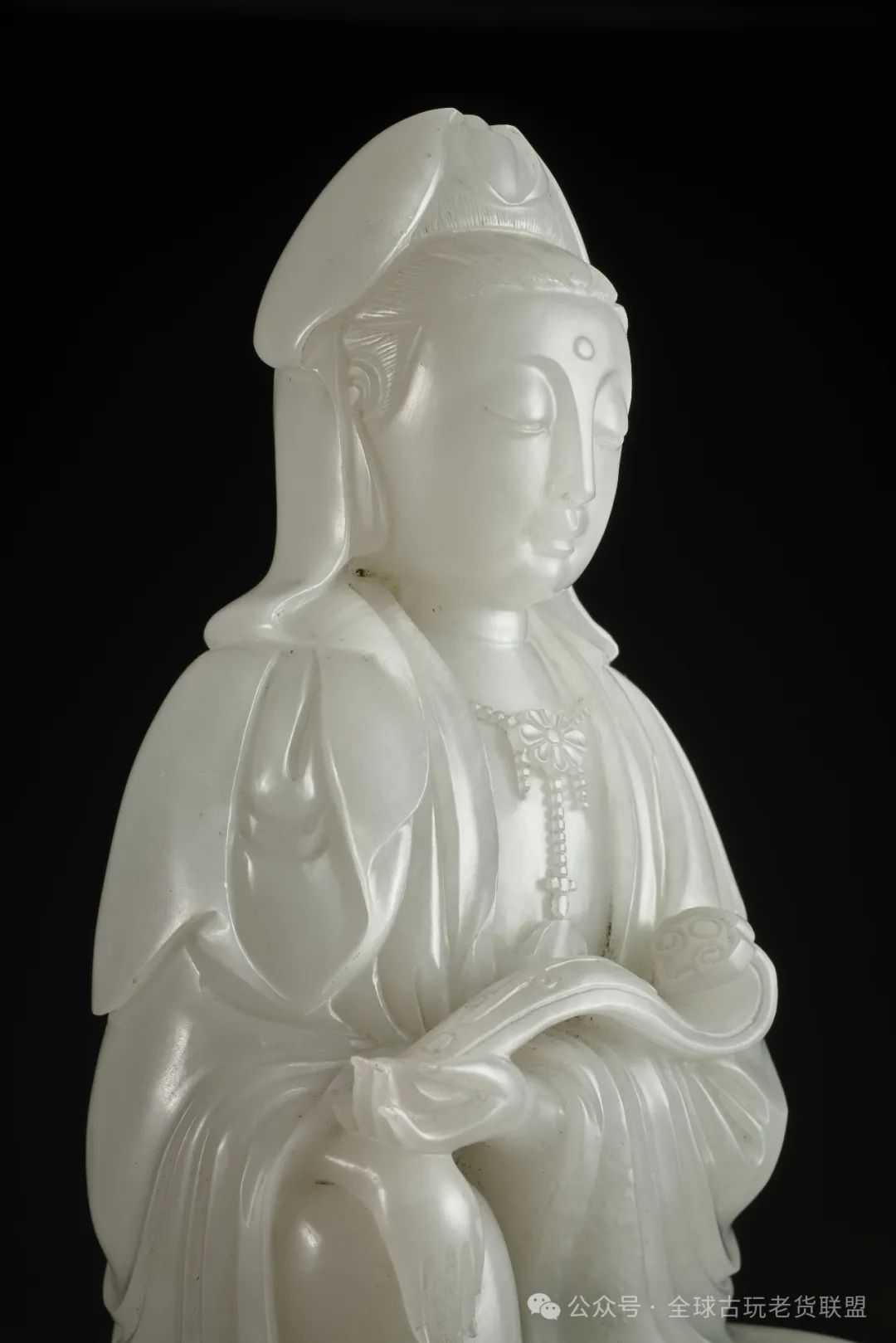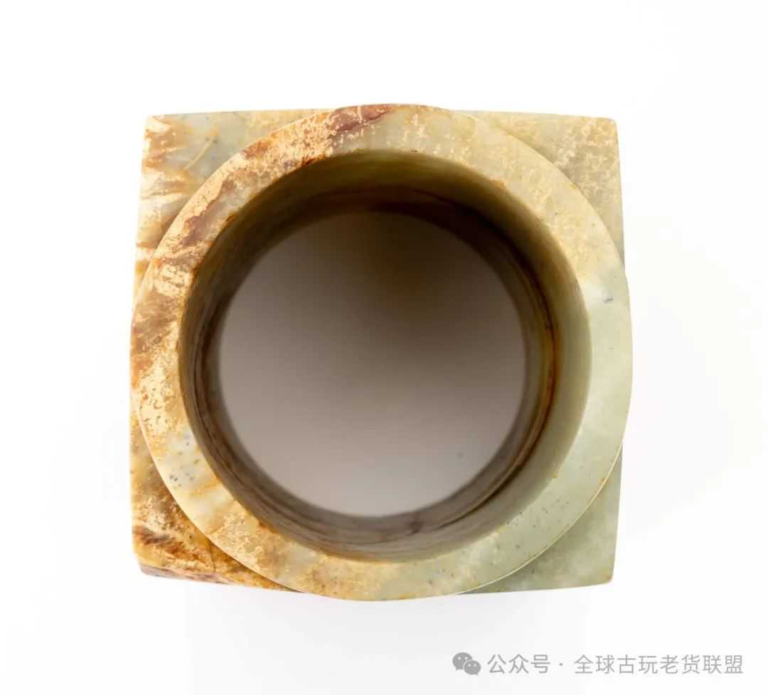此件拍品青玉质,温润纯厚,部分钙化,局部有黄、褐色沁。琮内圆外方,两端有射,射管外壁略方,中孔圆形,孔内饰台阶痕。整器打磨抛光讲究。此玉琮工艺,体量修长,宁静沉稳,散发历史厚重感,展示出先民与神灵深度沟通之境界,应为当时至高等级的祭祀礼仪用器。