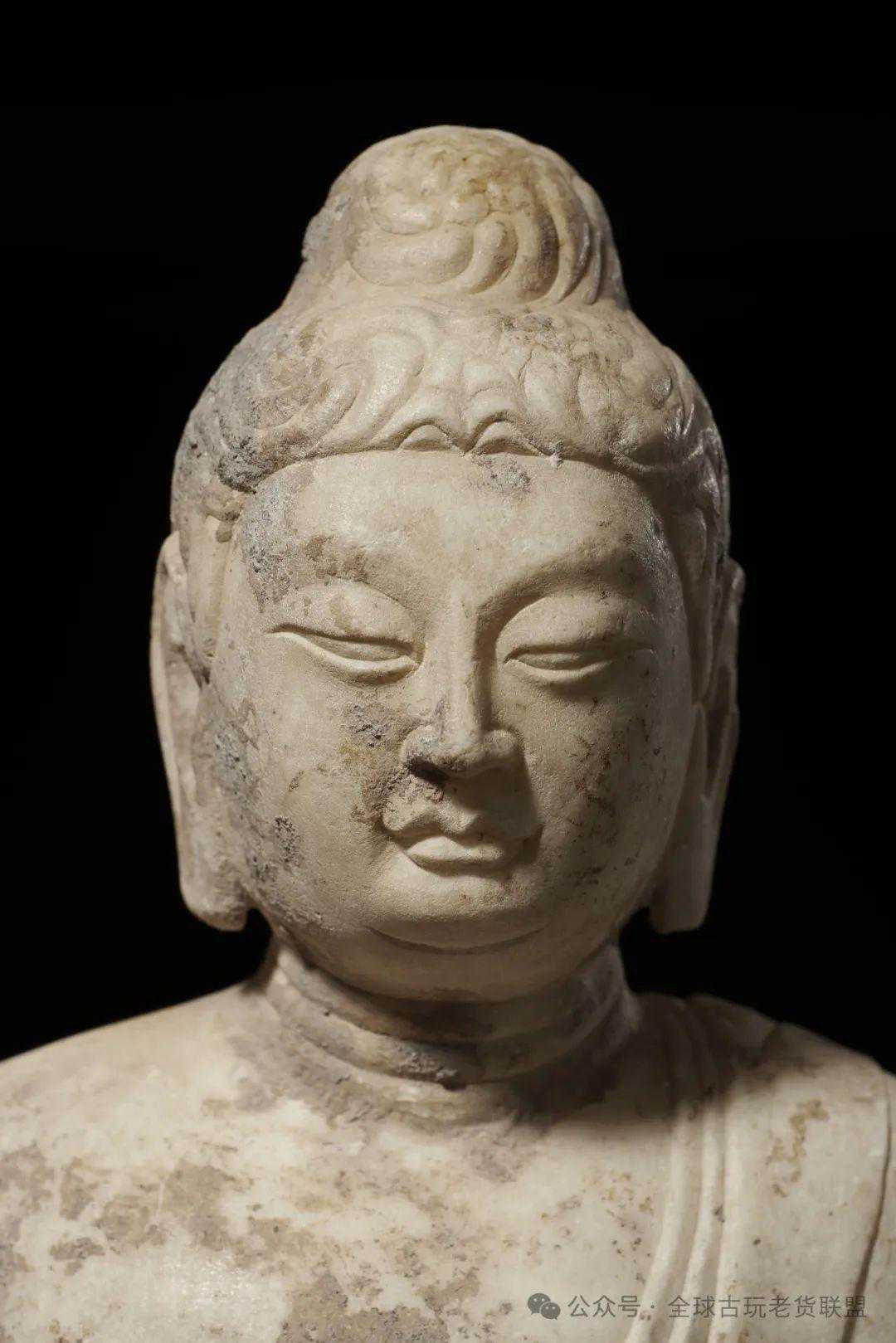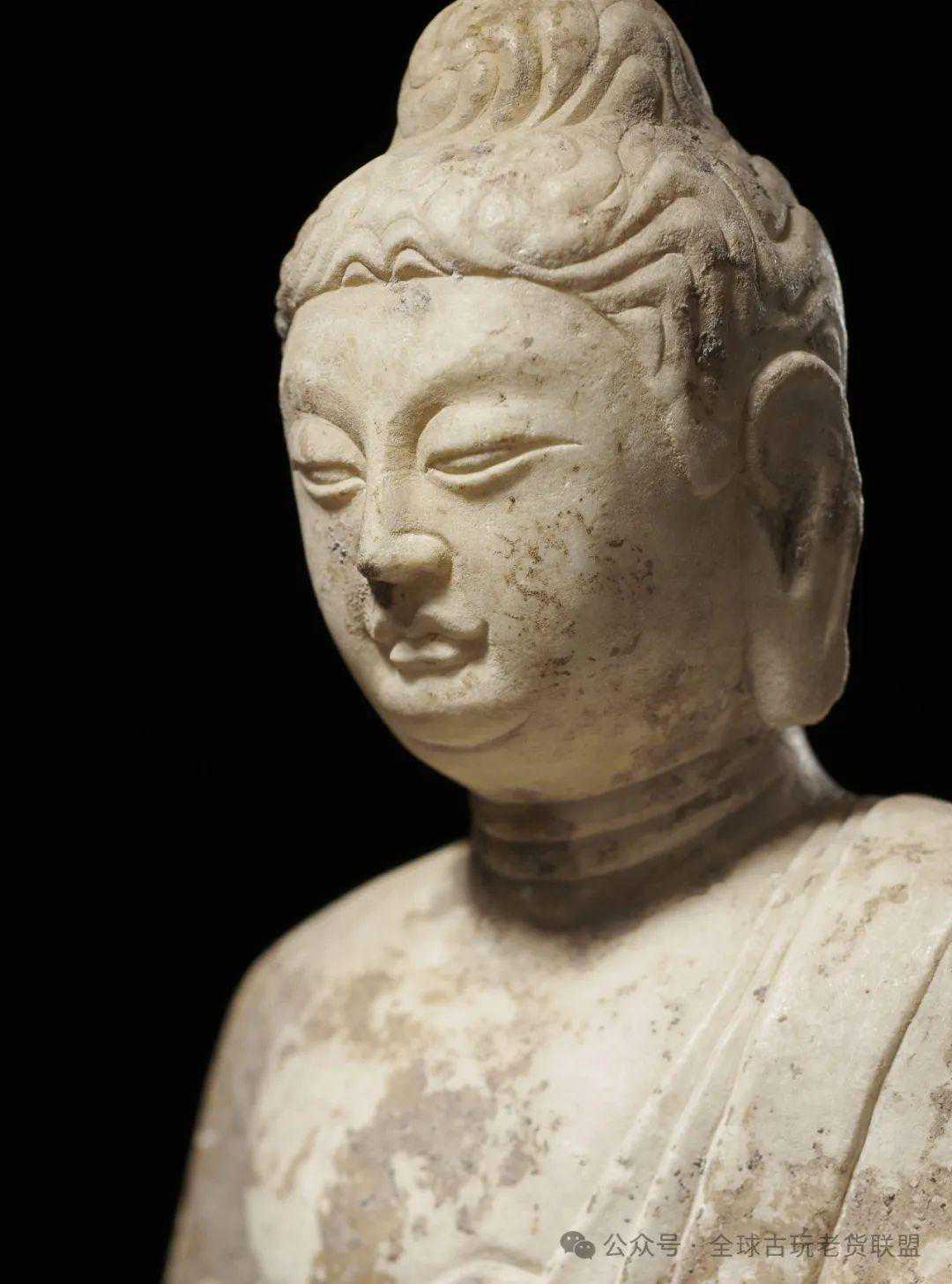 「二佛并坐」是中国佛教艺术特有的造像题材,在北魏至隋代盛极一时,以释迦、多宝二佛并坐为典型特征,源于《妙法莲华经卷四•见宝塔品》。经中记载,过去多宝佛行菩萨道时发大誓愿,若成佛、灭度之后,于十方国土有说《法华经》处,为闻是经,多宝塔必现,为作证明。当释迦佛欲说法华之际,多宝塔从地踊出,释尊分身云集,依众之请,开启塔户,多宝佛邀请释迦佛入塔,并分半座与释迦佛,「尔时,大众见二如来在七宝塔中师子座上结加跃坐」。两像头部背光,眉目清新秀气,大耳垂肩,佛右手掌心朝外,五指伸直向上施无畏印,左手施如愿印,结跏跌坐,披巾垂肩,腹前交叉穿璧,衣摆悬垂于须弥座前,独立并列,右侧佛身侧立一胁侍菩萨。整件造型古朴,刻画简饰,线条流畅自然,刀法犀利,透出智慧、慈悲、安详、高贵之气质,具有极高的艺术性。