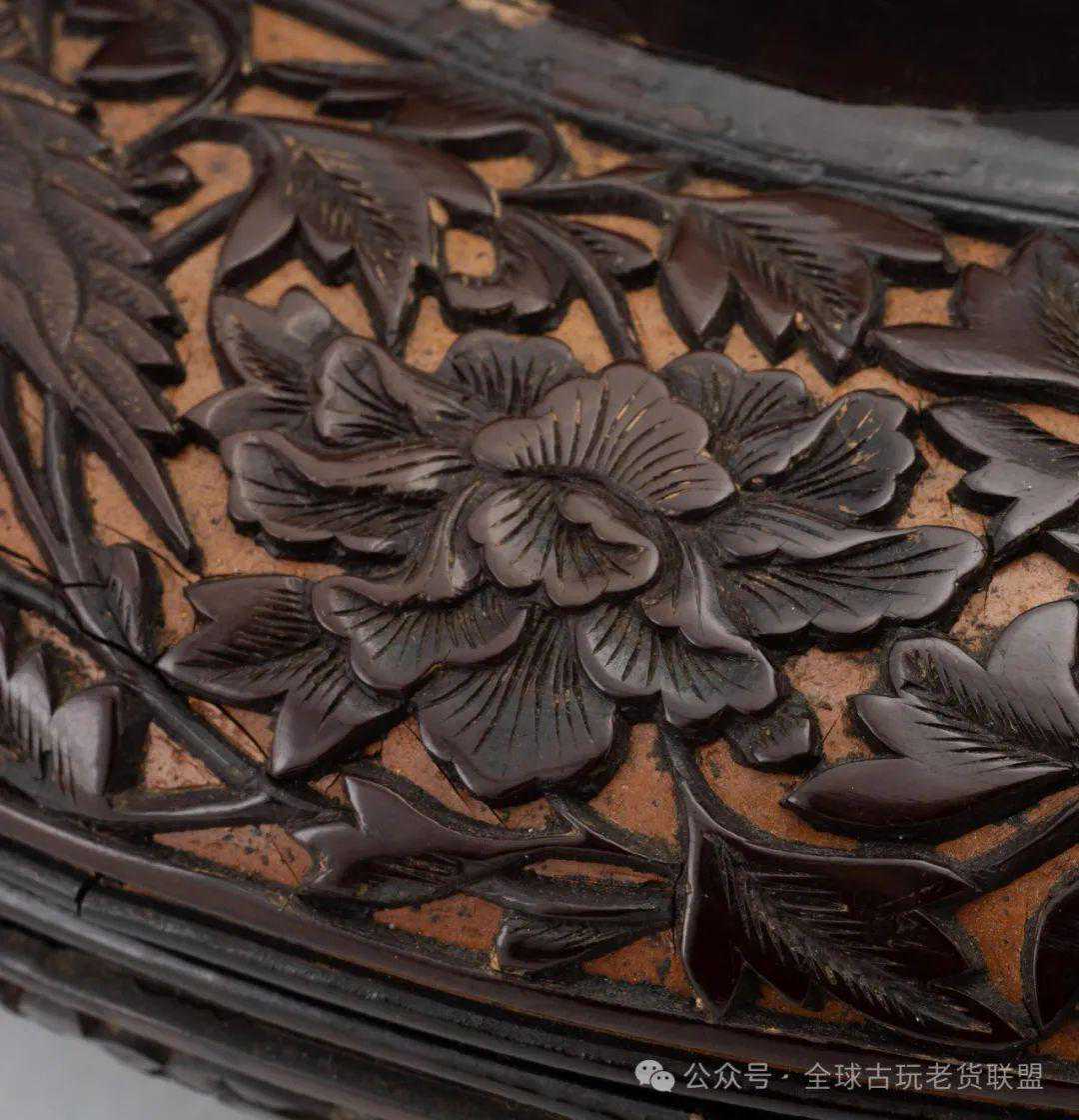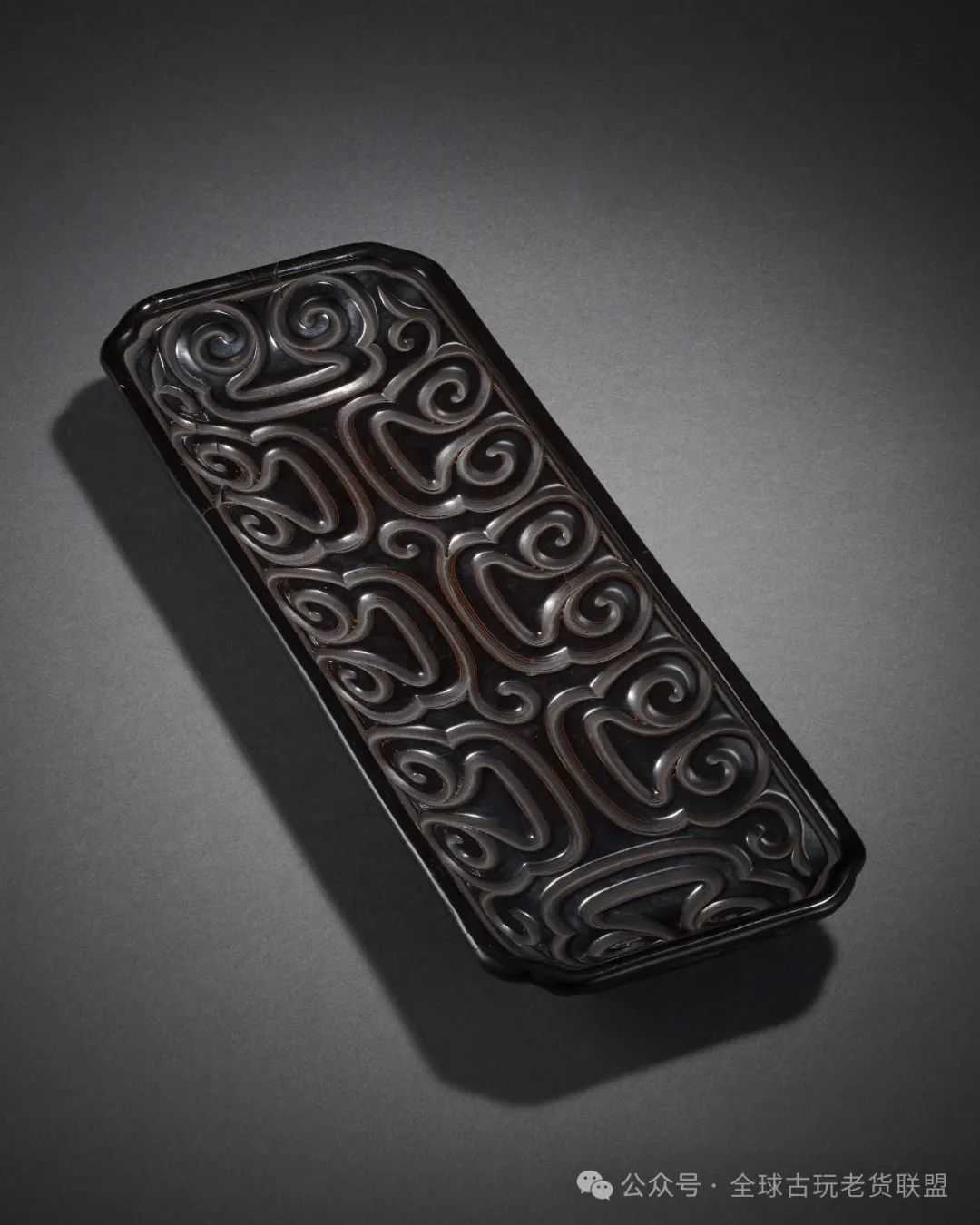 此件漆器平面呈倭角长方,侈口浅腹,向下内收,平底承以矮圈足。通体以剔犀工艺装饰,盘内剔刻对称排列的如意云纹,盘外壁刻卷草纹。盘底以细针款刻“杨茂造”三字。