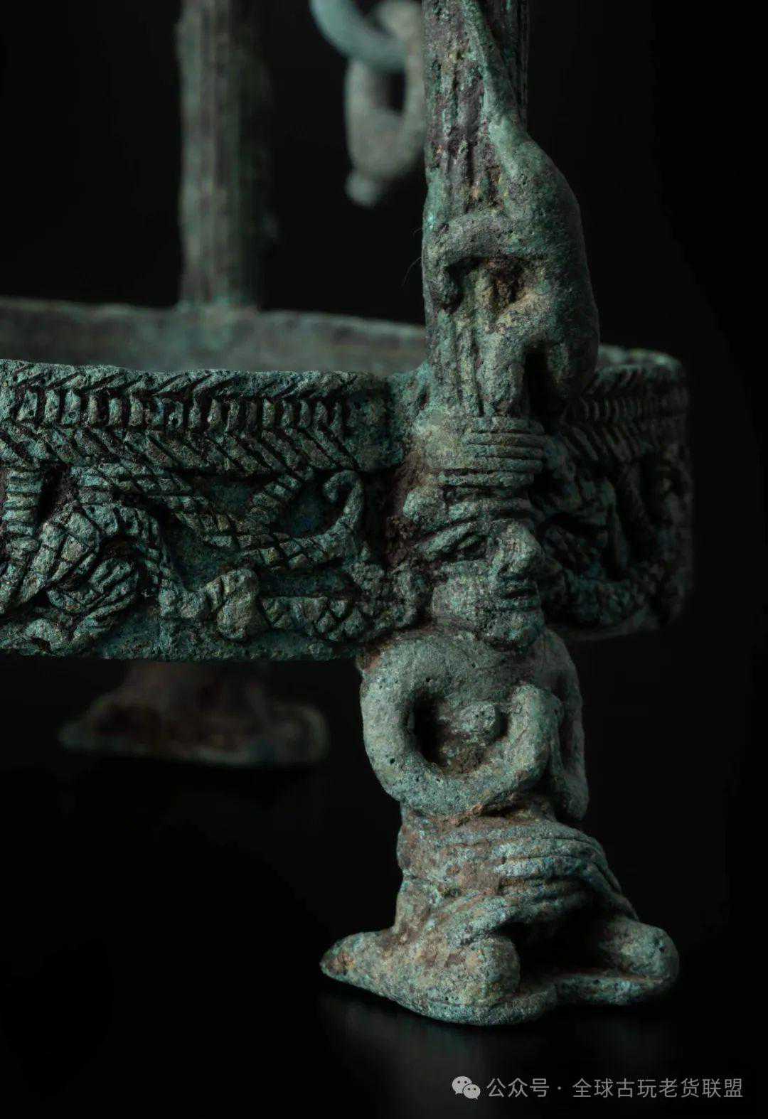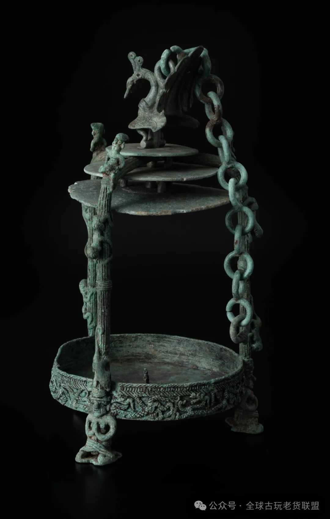 青铜灯至迟在战国时期出现,最著名者莫过于中山国出土的十五连盏树形灯。至汉代,灯具发展壮大,出现了悬挂式灯、手持式灯、以及艺术性极高的人物和动物形陈设式灯,除青铜外,还涵盖陶、瓷、玉、铁等材质。西汉末年至东汉,升仙思想在宫廷和民间广为流传,大量龙、凤、仙人形象出现在青铜、陶瓷器上。此件悬灯正是这一背景下的产物,融合祥瑞、神人,设计精巧,集艺术性与实用性于一身。