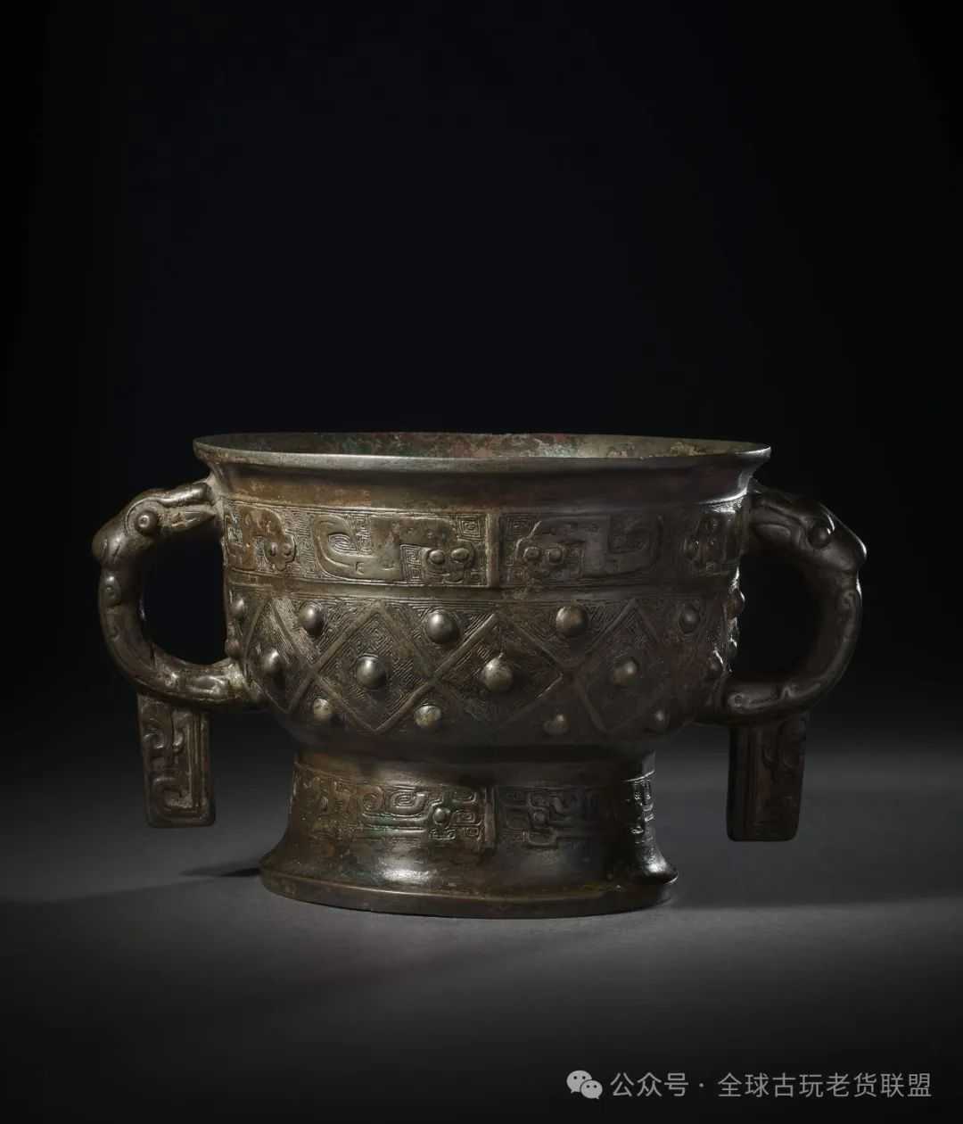 此簋为西周早期典型制式,通体褐红铜色,上布点点斑驳绿绣,是常见的晚清民国传世熟皮壳。