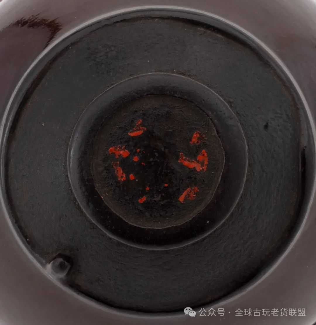 茶碗作为茶道中最重要的器具不可或缺,因为在茶会中,茶碗是惟一在主人与客人、客人与客人之间人手相传的茶道具。品茶之余,可以拿在手中端详鉴赏的也只有茶碗,相比之下,其他茶道具不具备上手把玩的条件。从古至今,在茶道中最受推崇的茶器首推天目茶盏,其贵重可见一斑。此件茶盏敛口弧壁,口微上卷,圈足外撇。或许是太珍贵的原因,盏里髹黑漆,盏外髹黑漆不到底,露胎处呈黑色,工艺精巧,别具匠心。
