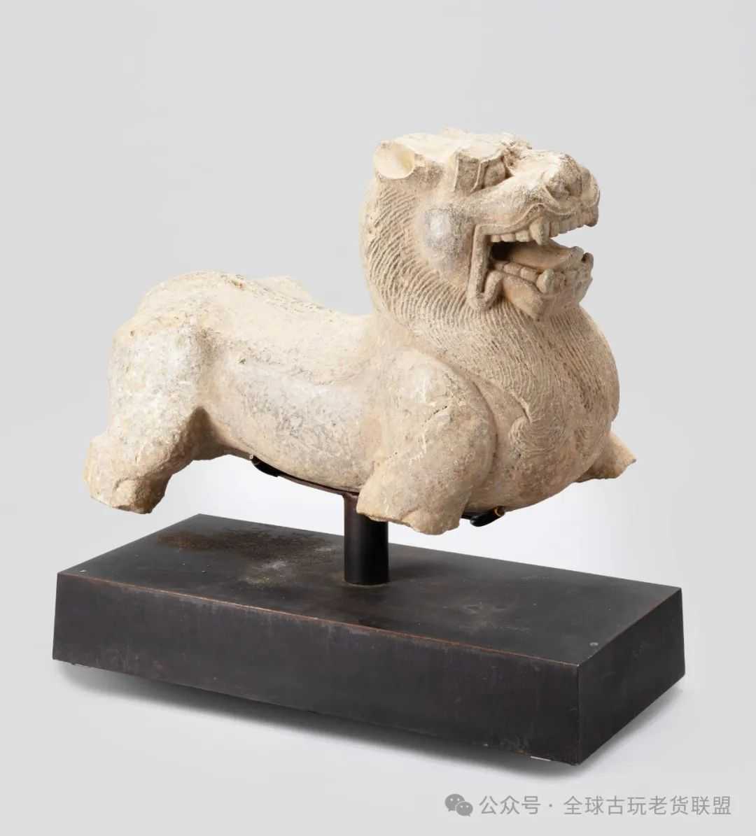 汉代由于丝绸之路的开通,石狮子及其艺术形象已传入中国,人们视石狮子为一种辟邪纳福瑞兽的观念,延续千年不变,但其间的狮子造型及其所蕴含的审美趣味却呈现出阶段性的变化。东汉石狮子大都做立式,呈迈步疾走状,它们的造型样式在初传中原时就表现的十分成熟,并与被称之为天禄、辟邪神兽的造型相似,期间区别仅仅在于两翼有无羽翼,头上有无饰角。此件石狮子造型劲健,胸突背曲,腰部收紧,椎骨突出,昂首,面部似虎,圆耳,如意形鼻,怒目张口,舌齿分明,颈部刻出细密的鬃毛,呈缕状,领下长须下垂并卷曲,下肢虽残缺,依然可以看出四肢交叉跨度很大,做疾走状,尾呈弧线下垂。整件结构比例准确,雕工精湛,造型体态矫健雄浑,肌肉感强烈,是十分难得的精品。